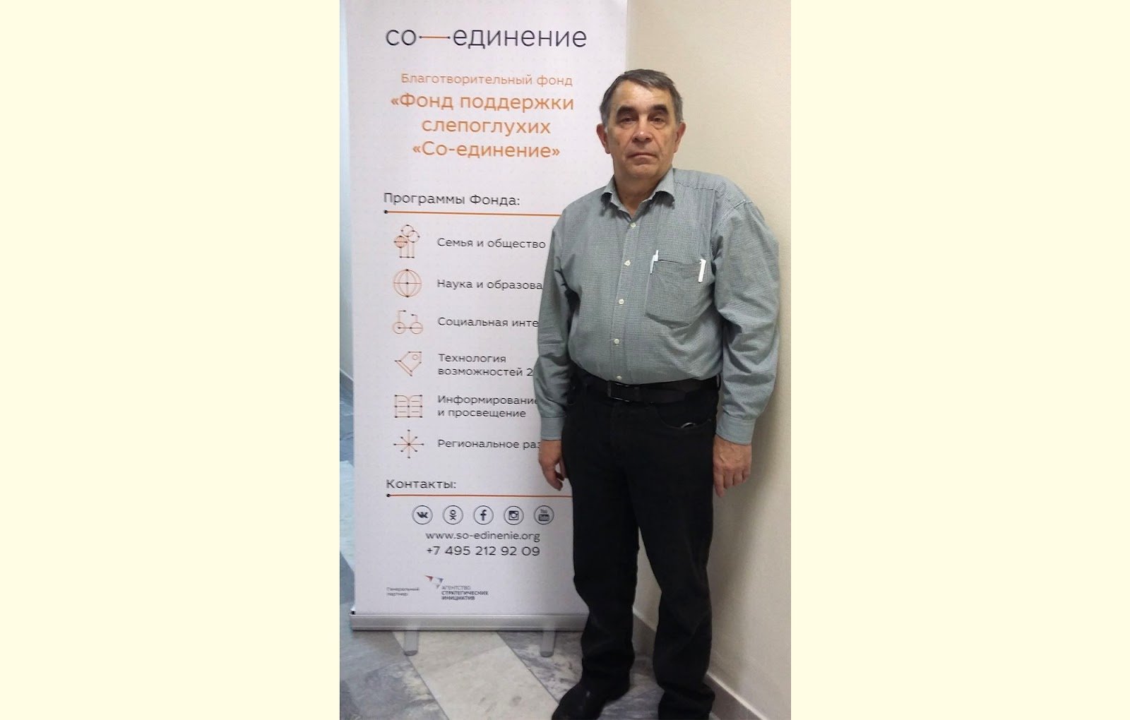 Тифлокомментарий: цветная фотография. Мужчина лет пятидесяти стоит у белого информационного стенда с оранжевой надписью: «Благотворительный фонд поддержки слепоглухих ‘’Со-единение’’». Мужчина невысокого роста, среднего телосложения. У него короткие русые волосы с проседью, овальное лицо, густые брови, небольшие глаза, широкий нос, тонкие губы. Одет в серую рубашку с длинными рукавами, черные брюки и ботинки. В нагрудном кармане — пара белых шариковых ручек.