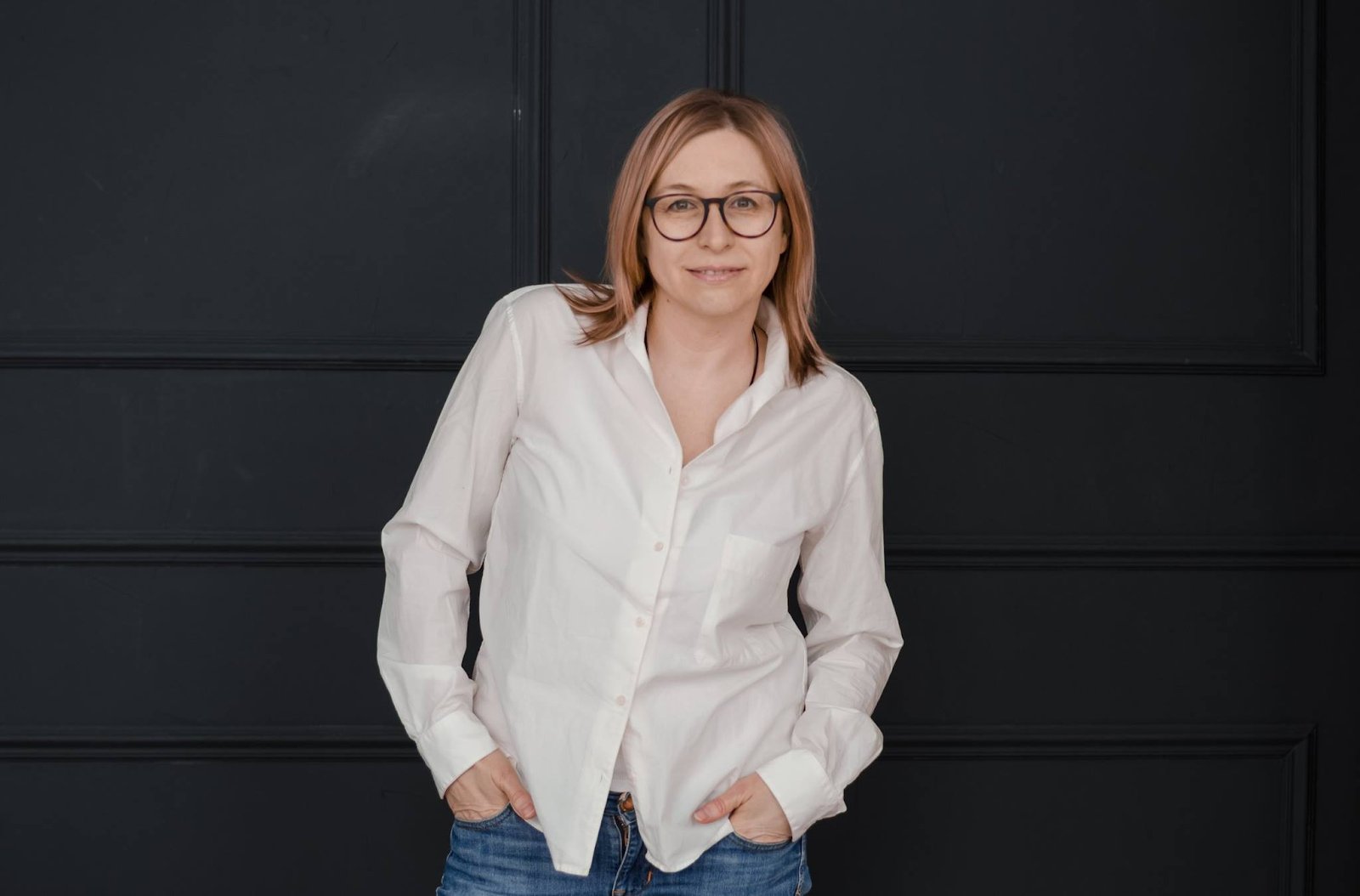 Тифлокомментарий: цветная фотография. Молодая стройная женщина в крупных очках стоит у черной стены, держит руки в карманах синих джинсов, улыбается. У нее русые прямые волосы чуть ниже плеч, овальное лицо, широкий лоб, карие глаза, аккуратный прямой нос, тонкие губы. Поверх брюк белая рубашка свободного кроя с длинными рукавами, верхние пуговицы расстегнуты.