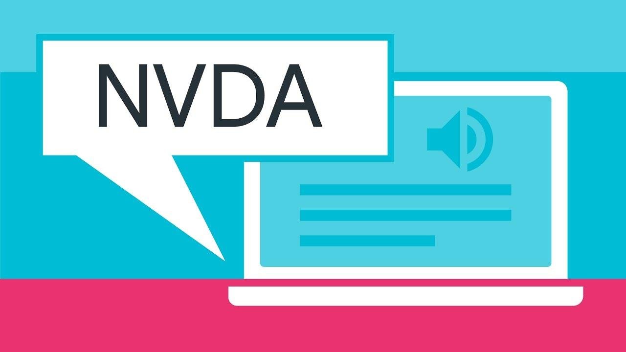 Тифлокомментарий: цветной коллаж. Основной фон голубой, внизу розовая полоска. Справа схематично изображен ноутбук. На экране значок громкости и три горизонтальные линии текста. От экрана слева белая прямоугольная сноска с крупной черной надписью: «NVDA».