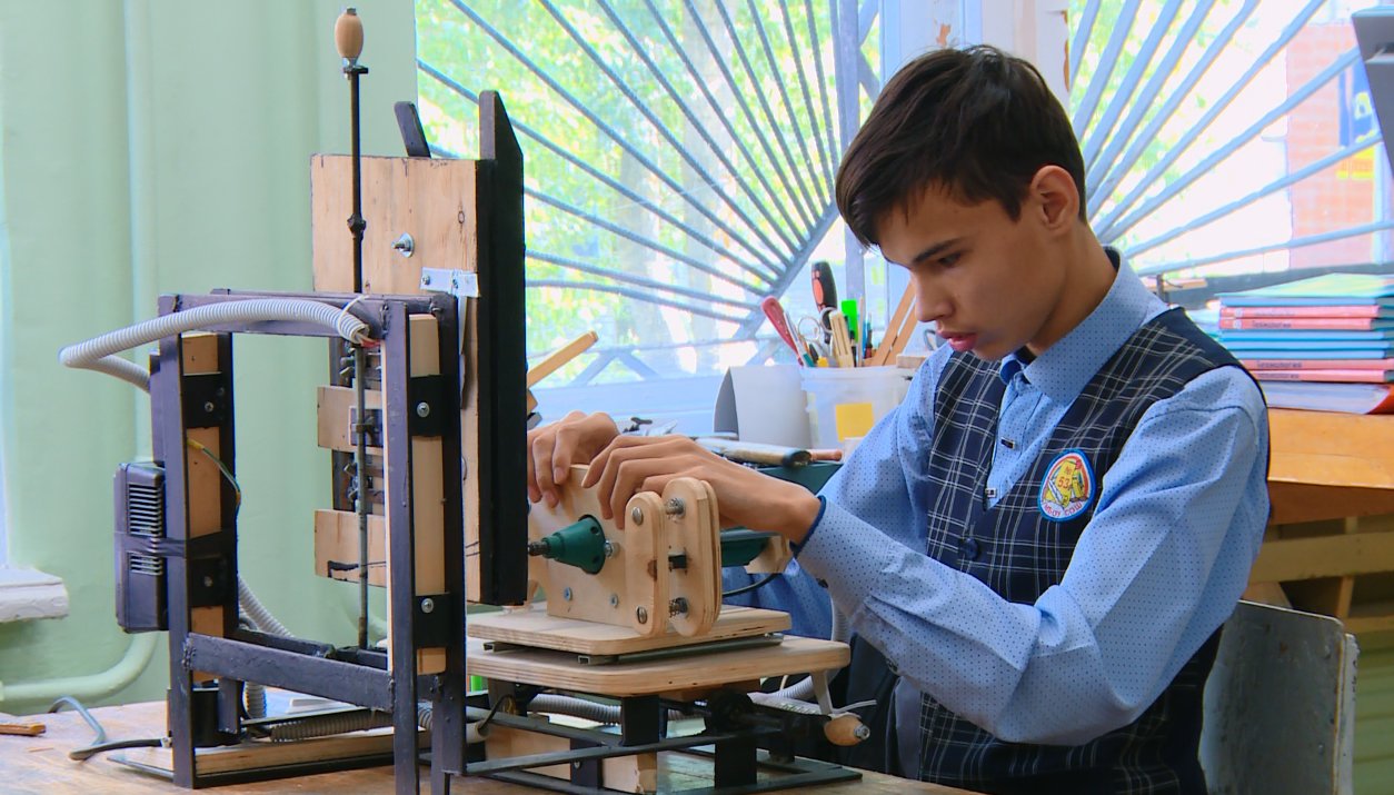 Александр Курышев знает, о чем говорит. Он автор десятка изобретений, которые собраны тут же, в мастерской. Пневмомолоток и чудо-рубанок, сверлильный аппарат и станок для резки металла. Подставки и стойки для металлорезки они вместе с ребятами собрали из старых стульев, доводили до ума полтора года. Сейчас станок работает через трансформатор, напряжение 12 вольт, и, как говорит педагог, он совершенно безопасен.