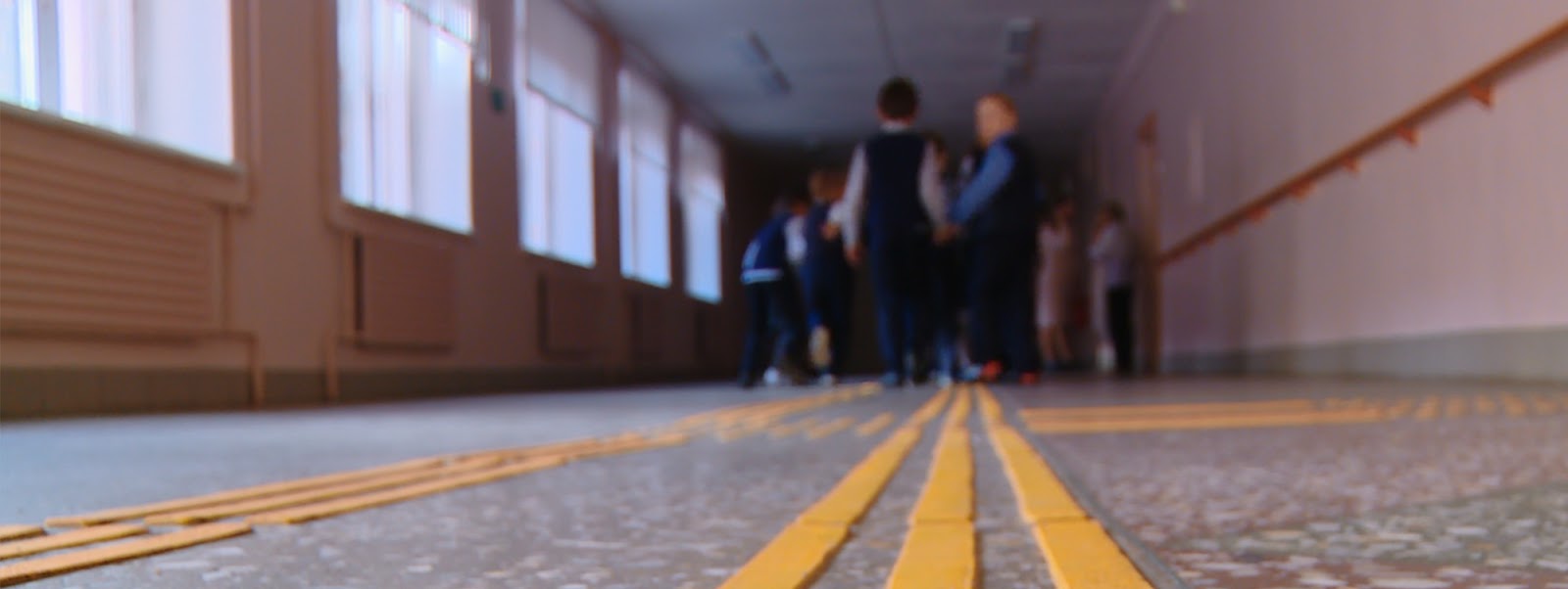 Робота выводят на стартовую позицию. Впереди длинный школьный коридор с тактильной разметкой. Справа — череда кабинетов. Александр дает голосовую команду: «Кабинет 209». Робот чуть заметно вздрагивает и начинает тихонько ползти вперед.