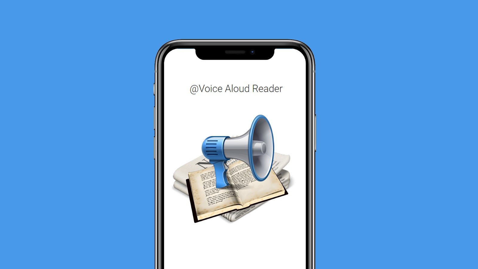 Тифлокомментарий: цветной коллаж. На синем фоне смартфон. На белом экране сверху название приложения: «Voice aloud reader». Под ним логотип: бело-синий рупор над стопкой газет и раскрытой книгой.