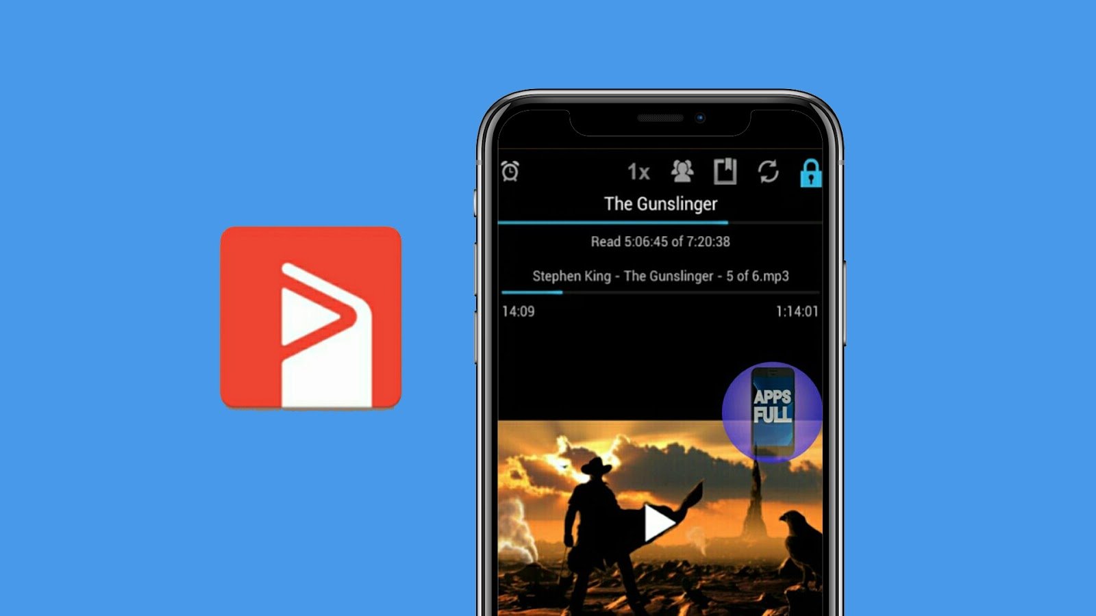 Тифлокомментарий: цветной коллаж. Слева на синем фоне логотип программы Smart AudioBook Player: в красном квадрате с белой вставкой значок Play. Справа смартфон. На черном экране фрагмент обложки аудиокниги Стивена Кинга «Стрелок».