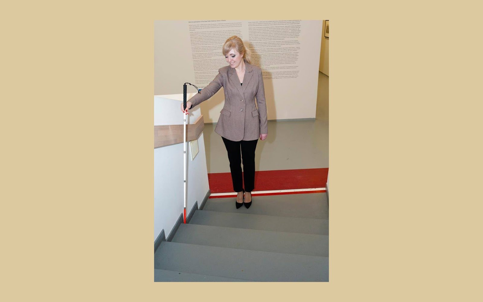 Тифлокомментарий: цветная фотография. Марта спускается вниз по правой стороне лестницы, подходит к ее окончанию (основанию). Правой рукой девушка держится за поручень. Тростью, наклоненной под углом 45 градусов, она исследует пространство перед собой. Впереди — ровная площадка с красным ковровым покрытием.