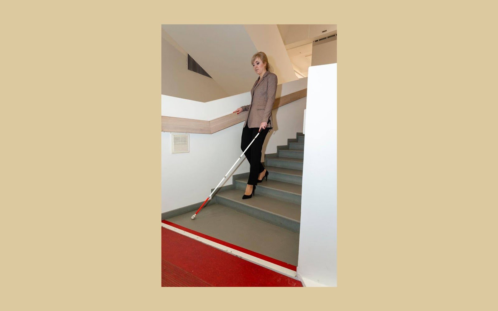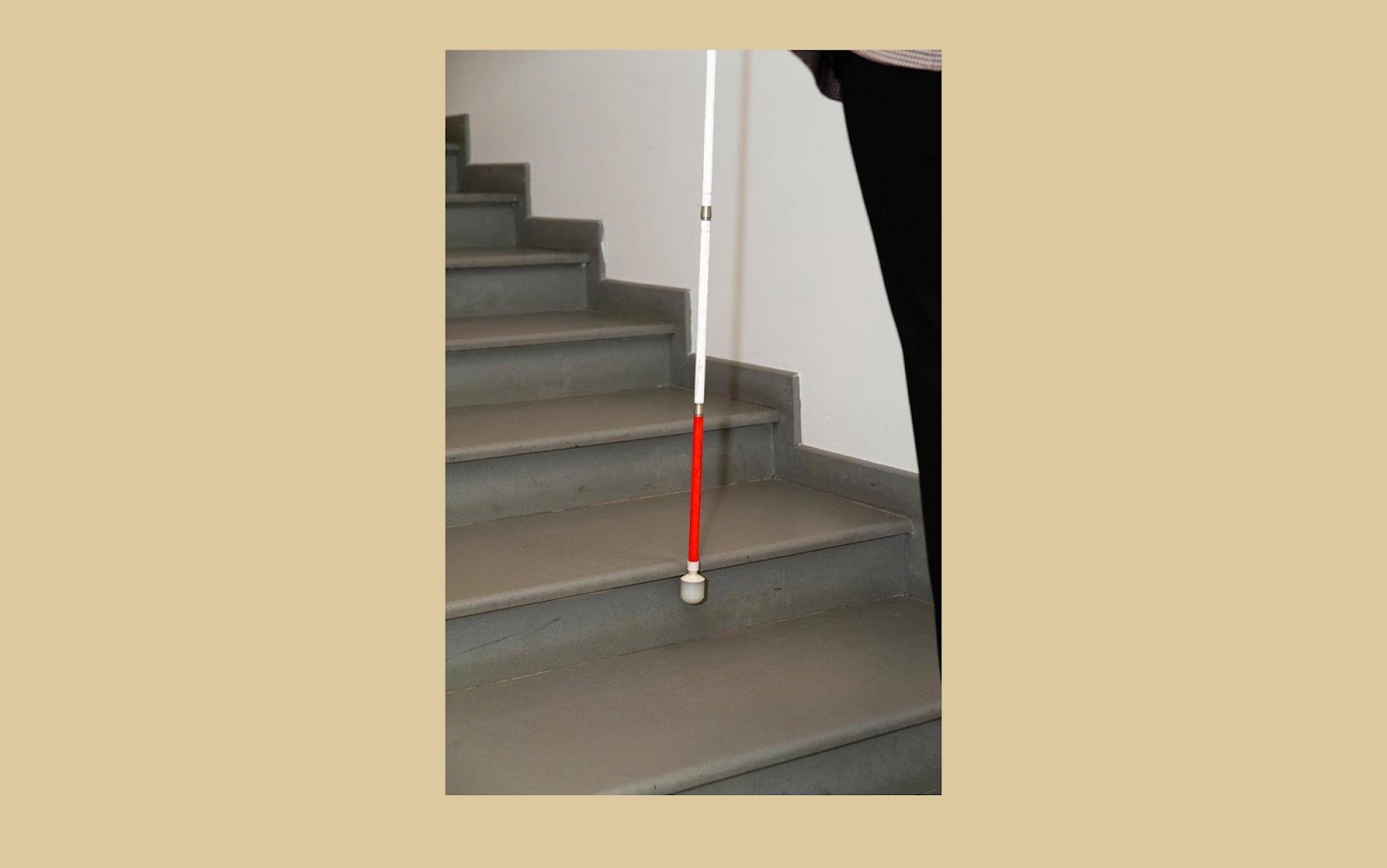 Тифлокомментарий: цветная фотография. Лестница, ведущая вверх. Трость с красной полосой расположена вертикально. Белый наконечник-цилиндр чуть касается ребра второй ступени.