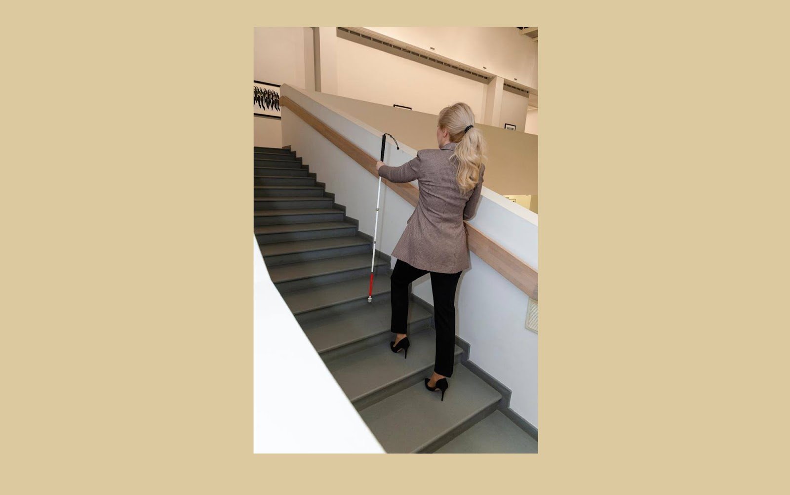 Тифлокомментарий: цветная фотография. Марта поднимается по лестнице. С обеих сторон лестница ограничена белыми парапетами высотой чуть ниже плеча, на парапете закреплен плоский деревянный поручень. Правой рукой Марта держится за поручень, в левой — прямо перед собой — вертикально держит трость. Ее наконечник касается ребра следующей ступени.