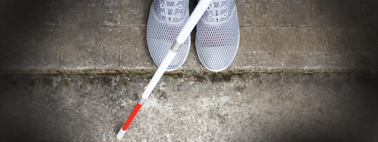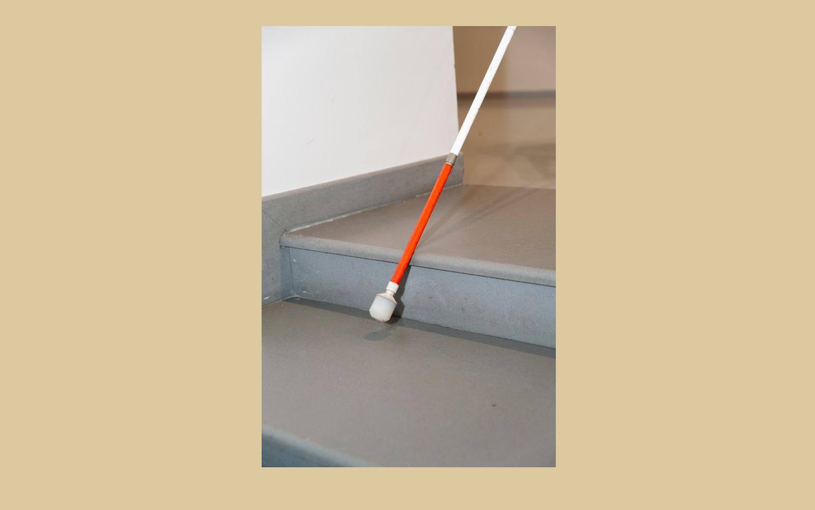 Тифлокомментарий: цветная фотография. Правая сторона лестницы, ведущей вниз. Первые две ступени крупным планом. Трость расположена наклонно. Красная полоса находится на ребре первой ступени, наконечник у поверхности следующей.