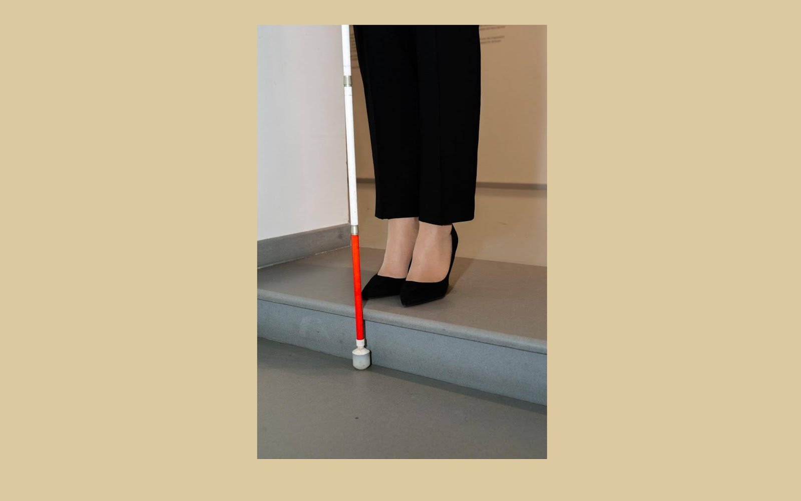 Тифлокомментарий: цветная фотография. Ноги Марты у края первой ступени лестницы, ведущей вниз. Она стоит у правого края, ближе к парапету. Трость расположена вертикально, прямо перед ней. Белый наконечник упирается в подступенок — пространство под первой ступенью.
