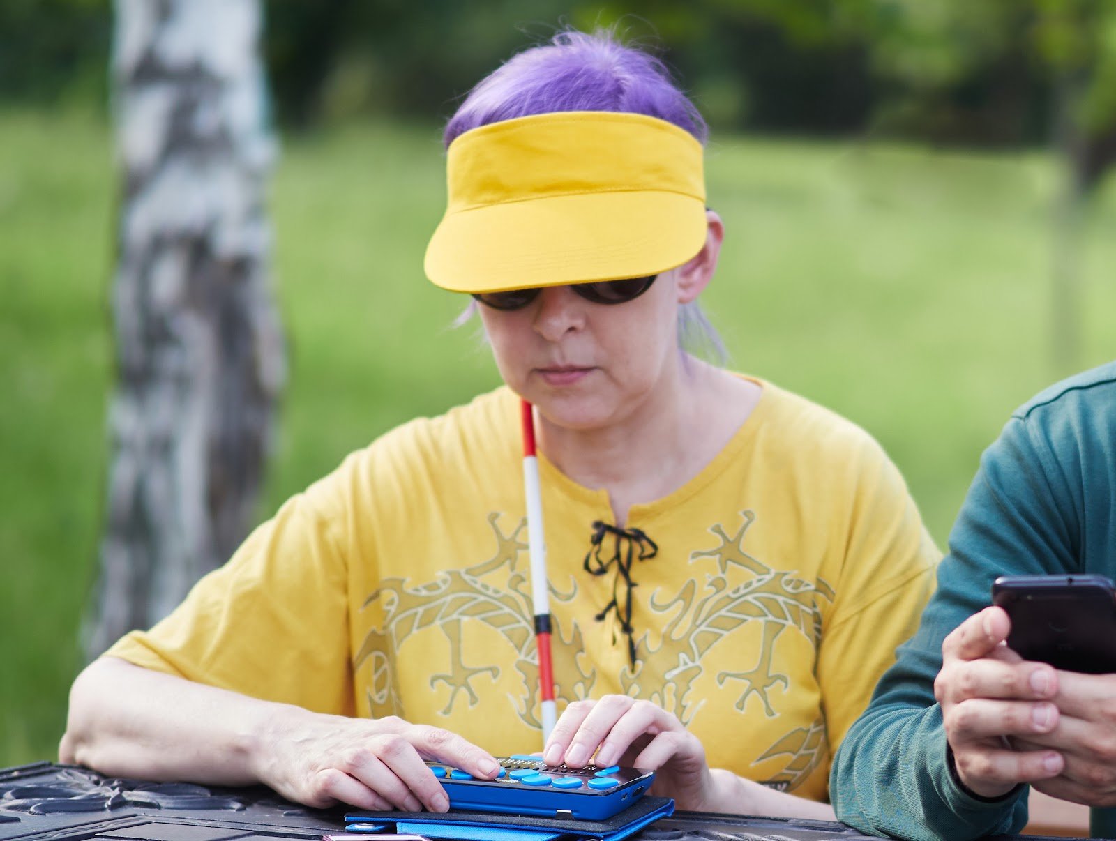 Тифлокомментарий: цветная фотография. Летний день. Крупным планом Ирина в черных очках, желтых футболке и кепке-козырьке. Она сидит, сосредоточенно нажимает кнопки брайлевского дисплея. Фиолетовые волосы убраны назад. К плечу прислонена белая трость. Позади виднеются ствол березы и лужайка.