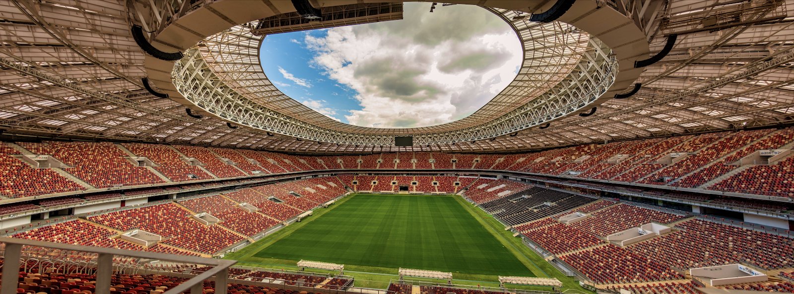 Тифлокомментарий: цветная фотография. Большая спортивная арена комплекса «Лужники». Вид с верхней трибуны на футбольное поле. Арена имеет форму эллипса. По периметру поле окружено двухъярусными трибунами, бордовыми с золотистыми элементами. Крыша стадиона представляет собой металлическую конструкцию в виде кольца. Ее центральная часть открыта. Видно яркое голубое небо с белыми кучевыми облаками.