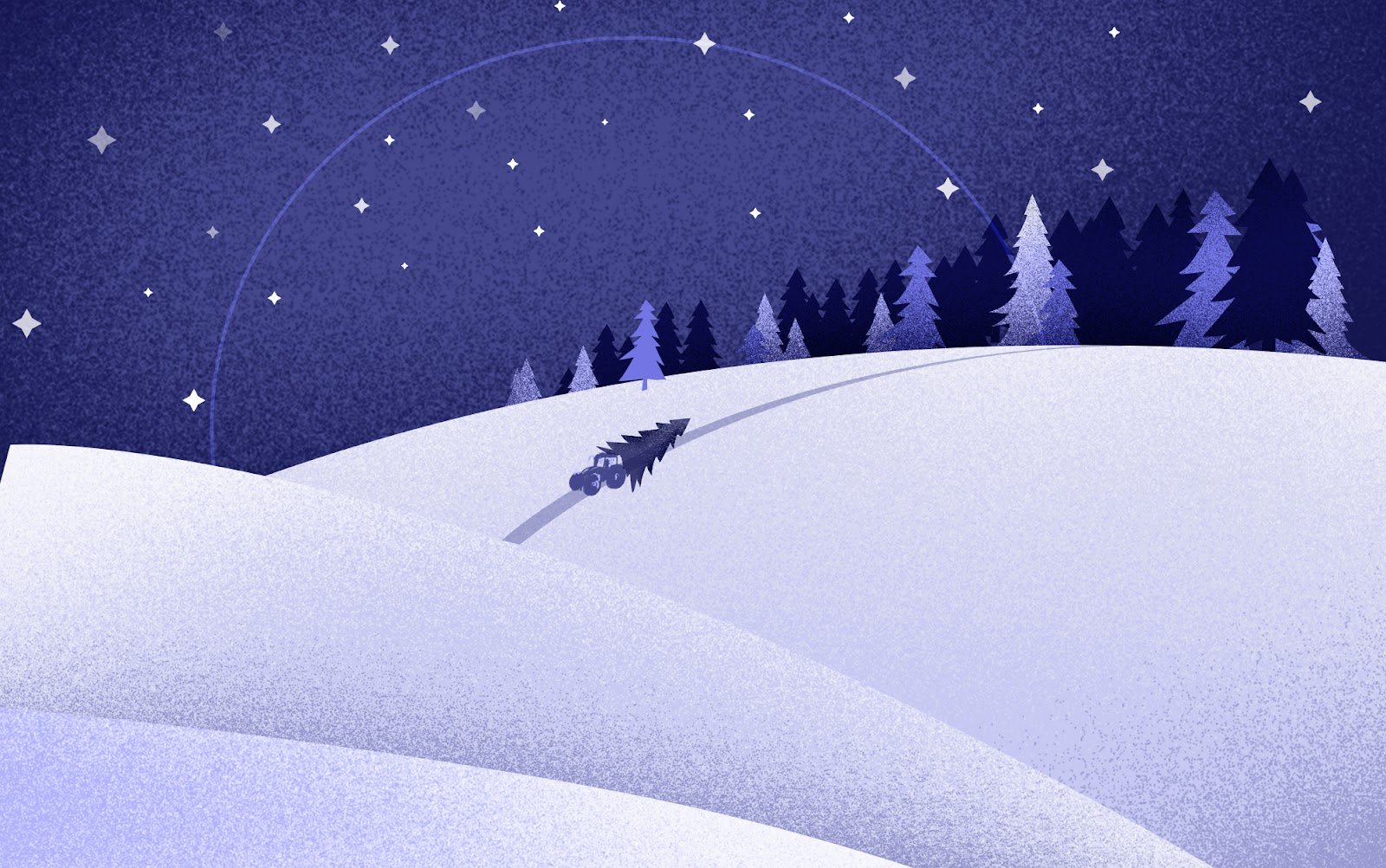 Тифлокомментарий: на темно-синем небе сияют белые звезды. По бескрайним заснеженным холмам едет трактор. Он движется по голубой дороге и тащит за собой большую елку. Позади него стеной стоит густой еловый лес.
