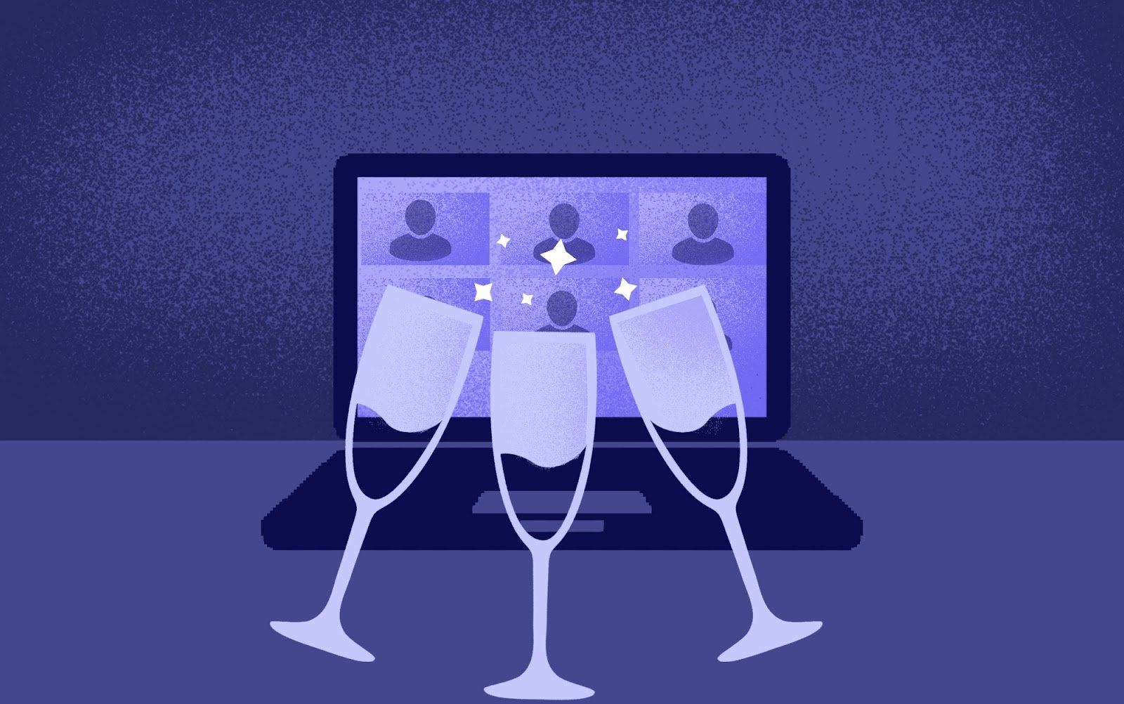 Тифлокомментарий: на синем фоне стоит открытый ноутбук. Его экран разделен на 6 частей, в окошках видны одинаковые иконки — голова и плечи. Идет сеанс видеосвязи. Перед ноутбуком «чокаются» три белых фужера. От них поднимается салют из белых звездочек.