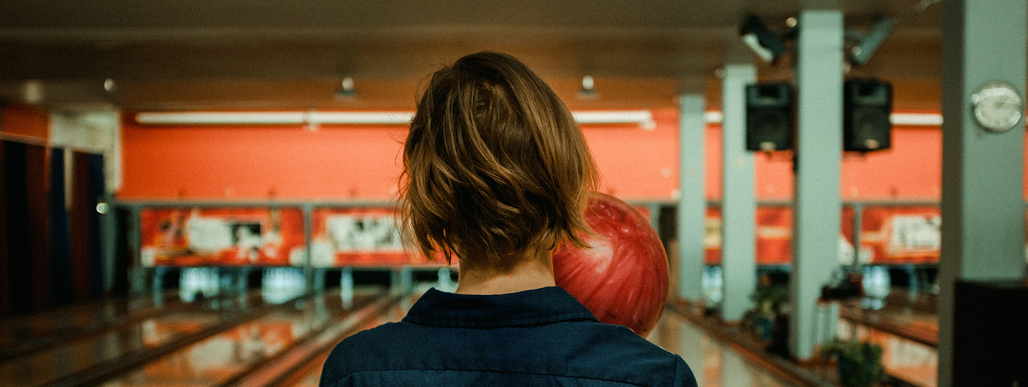 Тифлокомментарий: цветная фотография. Светлый зал для боулинга. На центральной дорожке спиной к нам играет молодой мужчина в темной одежде. Он только что сделал бросок. Рука его вытянута вперед. Синий шар вот-вот коснется поверхности дорожки, в конце которой стоит одна белая кегля. Задний борт затянут яркими баннерами с изображением кеглей и шаров.