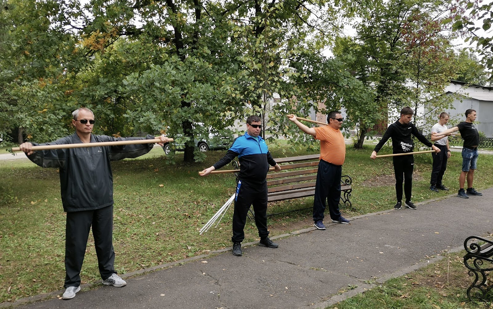 Тифлокомментарий: цветная фотография. Летний день в сквере. Вдоль парковой асфальтированной дорожки в ряд стоят пятеро мужчин в спортивной одежде и обуви. Трое из них плотного телосложения в темных очках, остальные — худощавые подростки. Каждый выполняет упражнение с длинной деревянной гимнастической палкой: держит на вытянутых руках перед собой или заводит за спину. Один из подростков тренируется под руководством инструктора. На заднем плане — парковая скамейка, несколько зеленых деревьев.