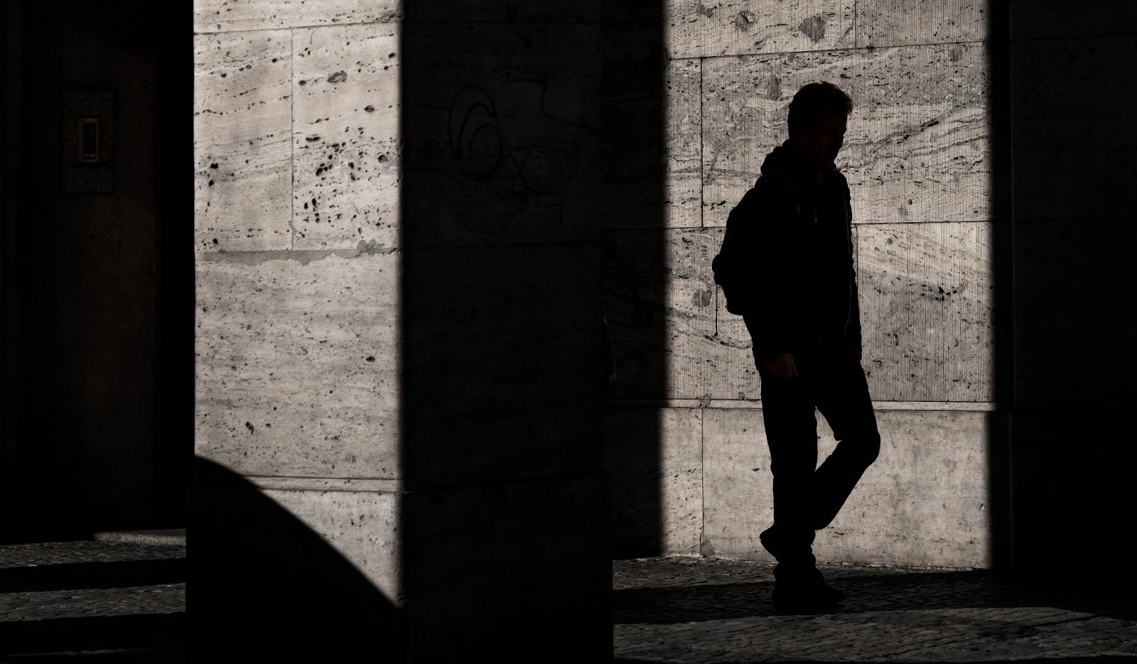 Тифлокомментарий: цветная фотография. Полоса солнечного света в темном помещении с каменным полом. Мужчина в черном костюме и коричневых ботинках пересекает ее. Видны только нижняя часть его тела и длинная тень.