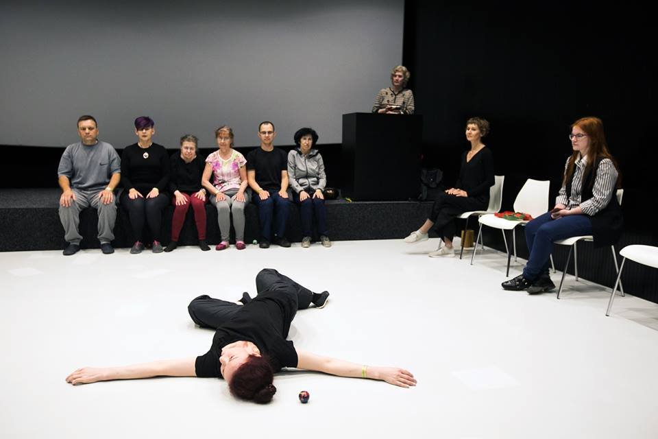 Тифлокомментарий: цветная фотография. Зал с черными стенами, белым широким экраном, белым полом и серым подимумом. На полу в центре зала лежит женщина в черной одежде с темно-красными забранными в пучок волосами. Ноги ее согнуты в коленях, прижаты к полу и развернуты влево, руки распростерты в стороны. Рядом с ее головой лежит небольшой разноцветный мячик. Это Мария Чернова. Лица остальных актеров обращены к ней, они сидят в ряд на подиуме, у всех руки на коленях, еще одна участница стоит за черной трибуной, установленной на подиуме справа. На белых стульях у стены справа сидят рыжеволосая девушка и изящная женщина в черном костюме и белых кроссовках - это Лариса Никитина.