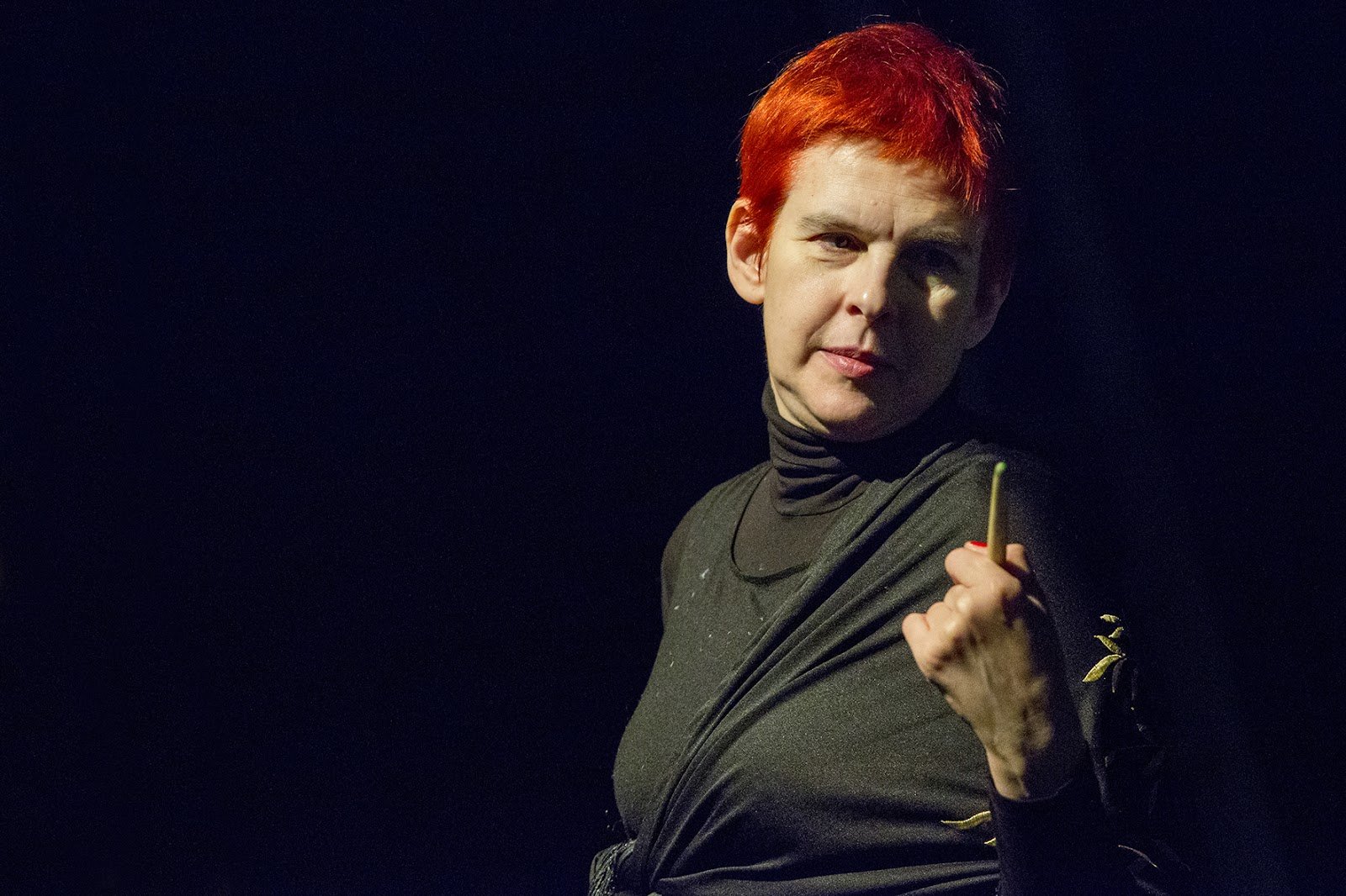 Тифлокомментарий: цветная фотография. На темном фоне вполоборота стоит Ирина Поволоцкая. У нее короткие красные волосы и ярко-красный маникюр, темная одежда с повязанной на груди черной тканью с цветочной вышивкой. Кисть левой руки поднята к плечу. В руке зажат небольшой желтый предмет, напоминающий кисть для рисования, с зеленым краем. Она повернула голову влево и наклонила немного назад. У нее крупные черты лица, густые брови. Фигура Ирины освещена ярким лучом софита слева, спина и правая часть лица – в тени.