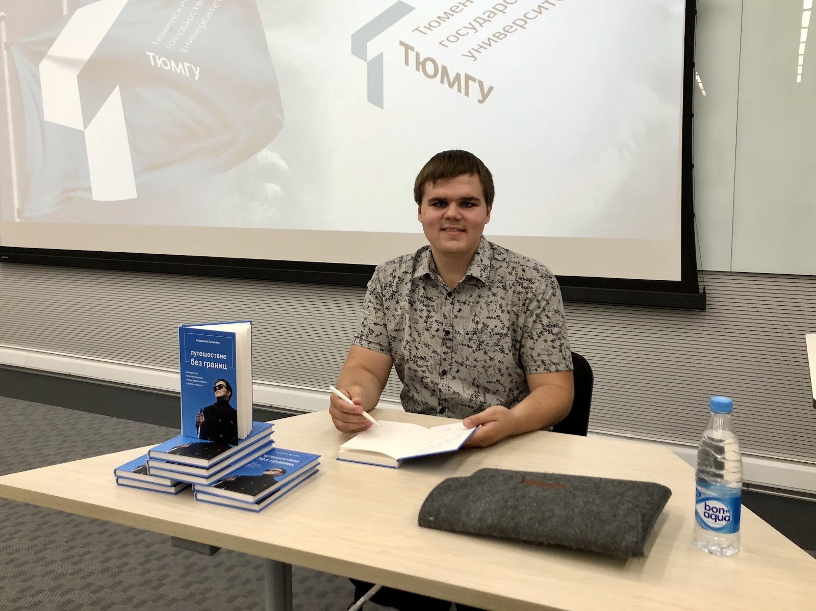 Тифлокомментарий: цветная фотография. Зал с большим проекционным экраном. На экране — заставка Тюменского государственного института. За столом рядом с экраном сидит улыбающийся Владимир Васкевич в бежевой с черным узором рубашке с коротким рукавом. На столе — бутылка с водой, серая фетровая папка и выставленные пирамидкой книги «Путешествие без границ». Перед Владимиром лежит открытая на первом форзаце книга, левой рукой он занес над ней белую ручку.