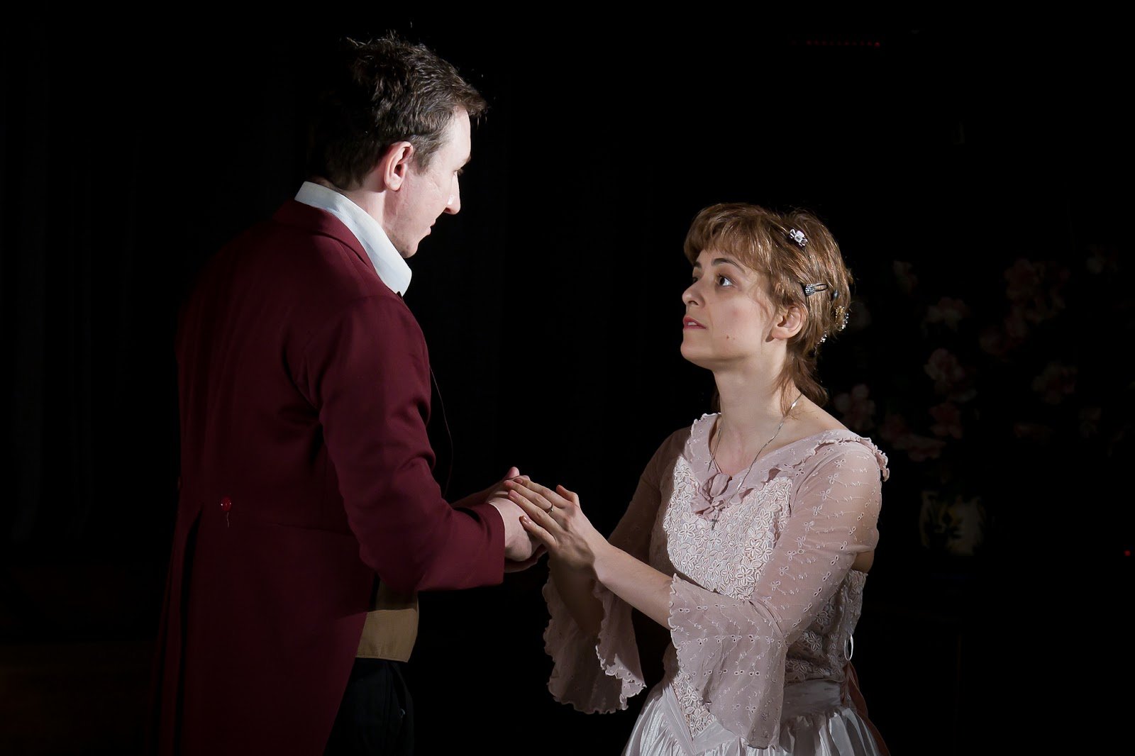 Тифлокомментарий: цветная фотография сцены из спектакля. На черном фоне стоят двое. Справа девушка в бежевом платье в стиле XIX века. Ее длинные русые волосы забраны назад и подхвачены заколками. Слева лицом к девушке стоит мужчина в красном сюртуке и белой рубашке. Девушка кладет свои тонкие пальцы на руки мужчины и с мольбой в глазах смотрит на него.