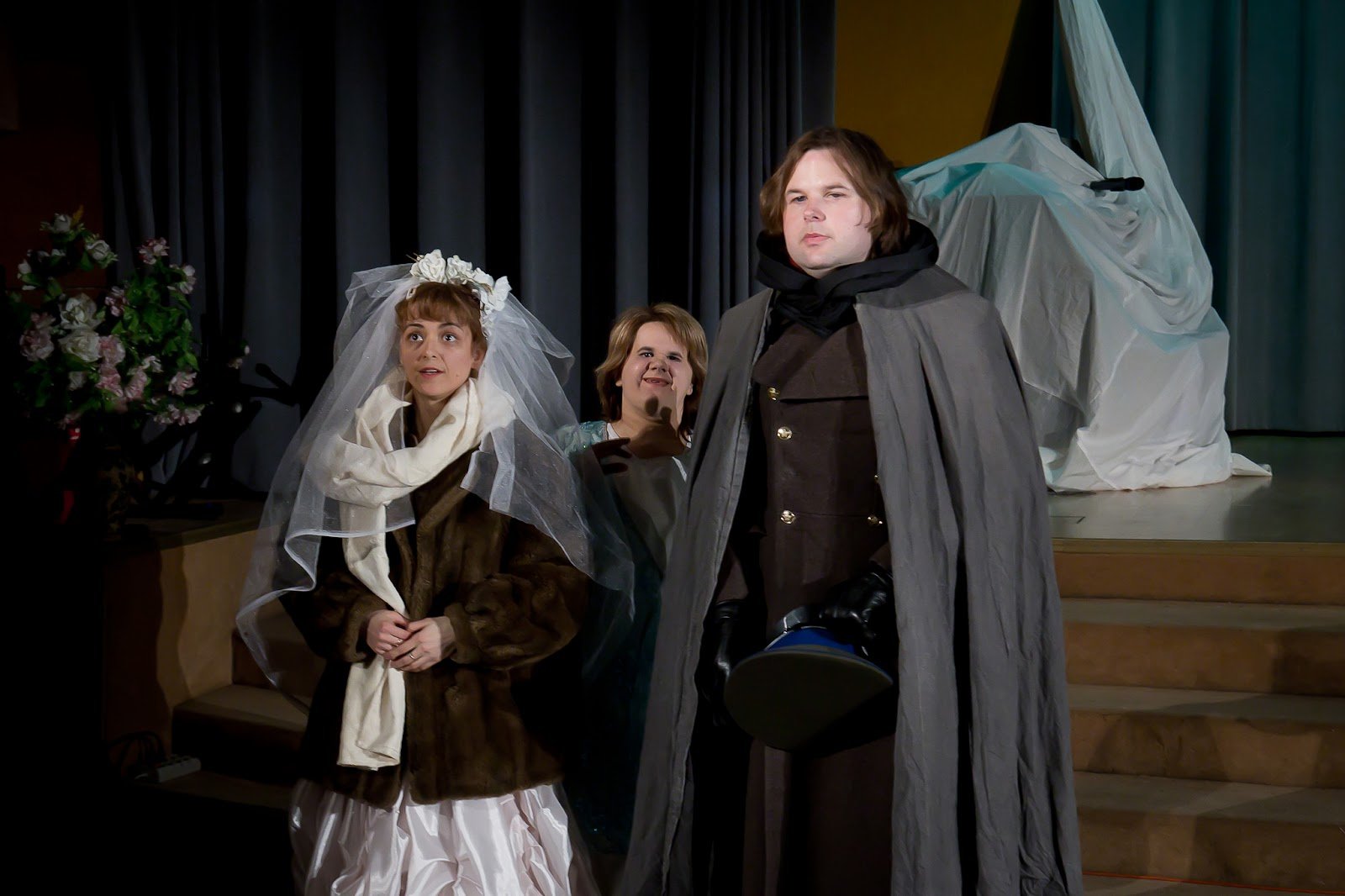Тифлокомментарий: цветная фотография, трое актеров стоят на сцене. На переднем плане девушка с предыдущего фото в свадебном платье, фате, шарфе и коричневой шубке. Ее взгляд направлен вверх. Рядом стоит с фуражкой в руках высокий плотный мужчина в плаще поверх шинели. Позади стоит и улыбается невысокая женщина. За спинами героев видна лестница, букет цветов и театральные кулисы.