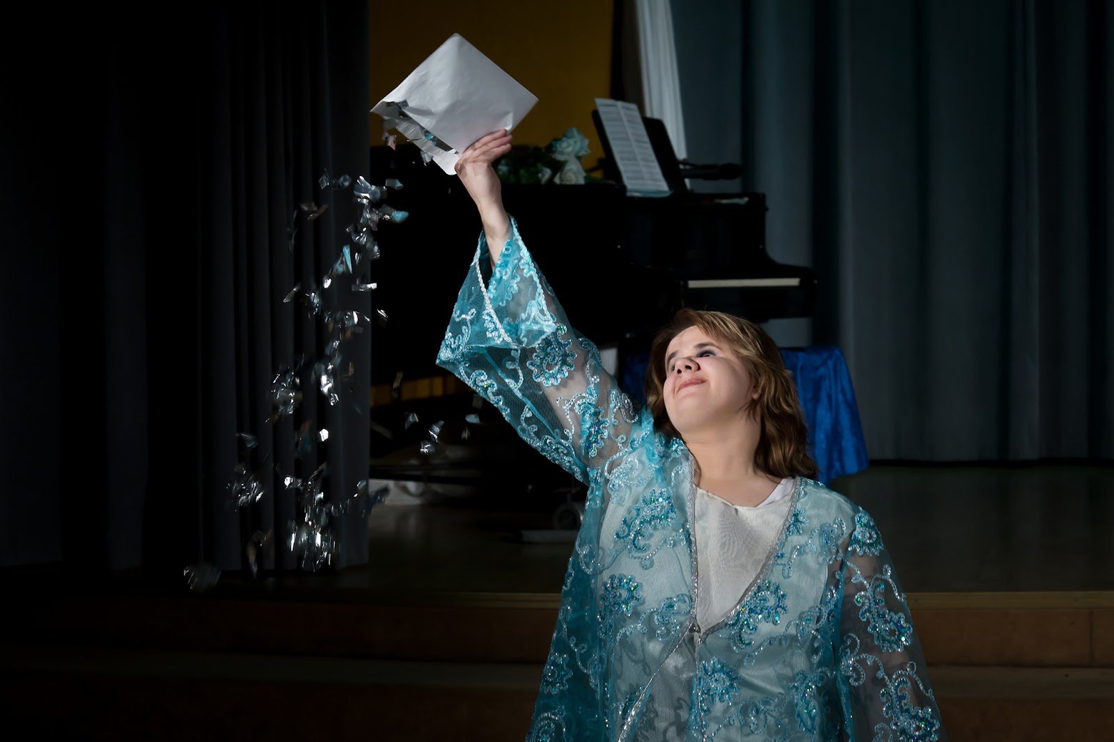 Тифлокомментарий: на цветной фотографии девушка поднимает вверх руку с распечатанным бумажным конвертом. У девушки русые волосы до плеч, на ней белая блузка без рукавов, поверх которой надета прозрачная бирюзовая туника с вышивкой и пайетками. За ее спиной виден прозрачный занавес, украшенный серебряной гирляндой, и открытое фортепиано с нотами.