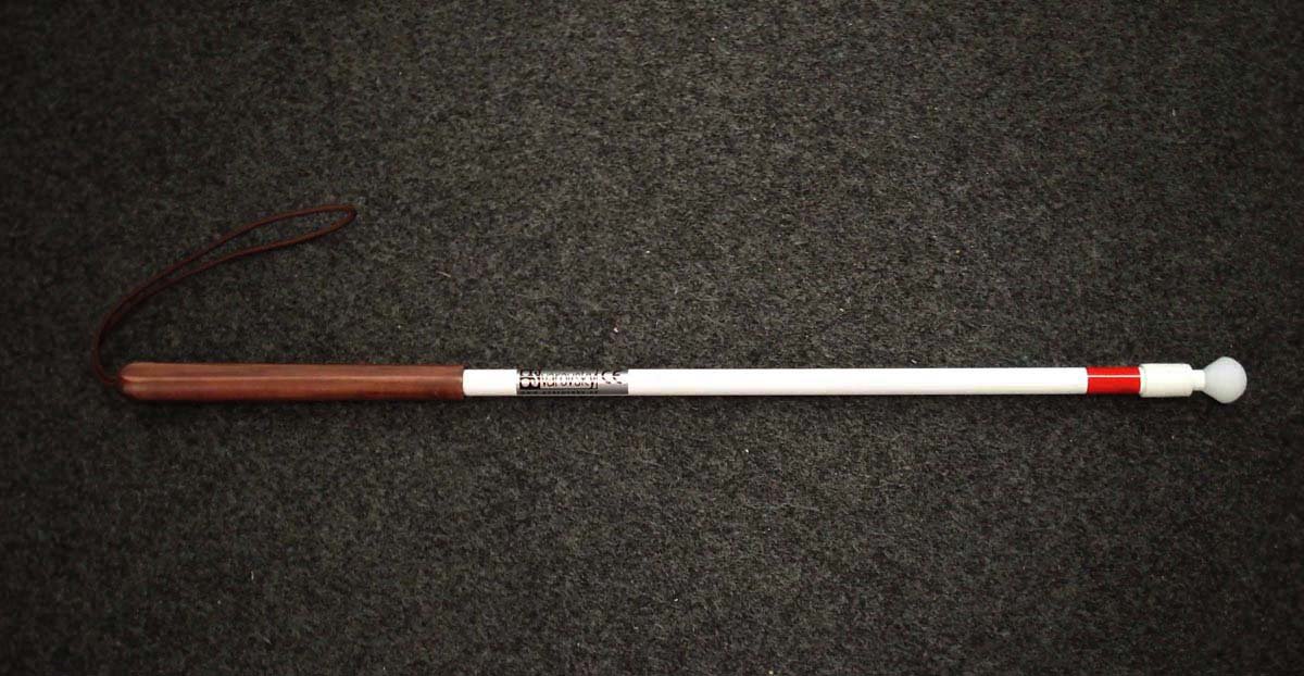 Тифлокомментарий: цветная фотография. На сером фоне лежит белая пластиковая телескопическая трость с коричневой ручкой и красной полосой перед наконечником-полусферой. Трость в сложенном состоянии.