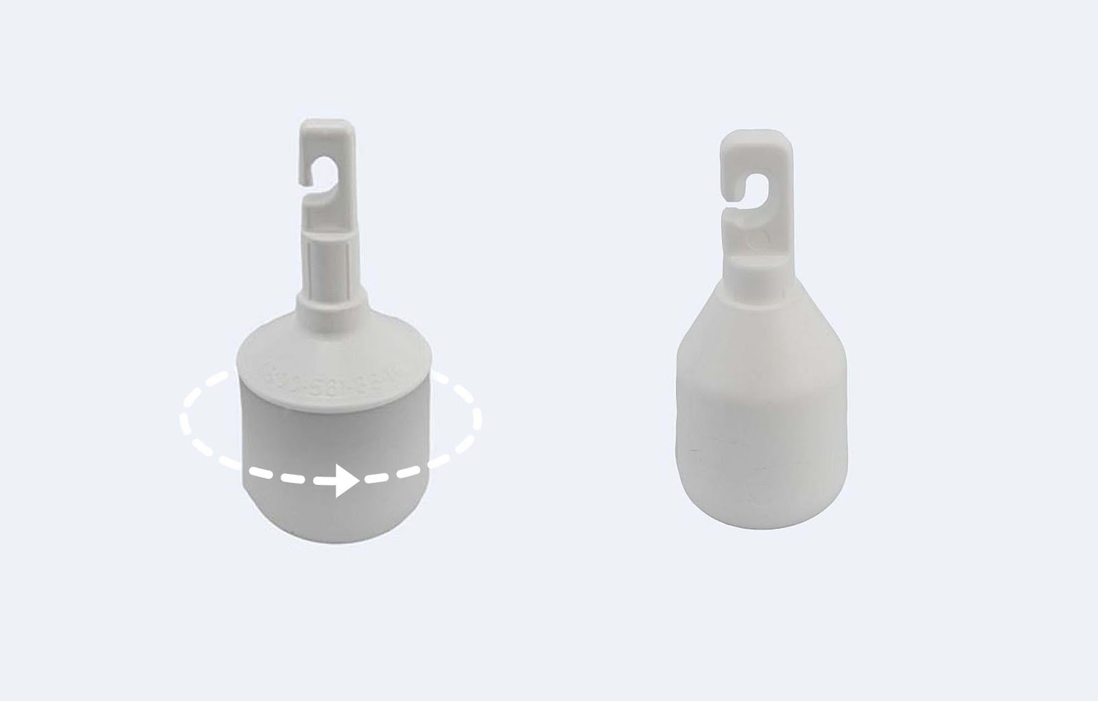 Тифлокомментарий: цветной фотоколлаж. На сером фоне два белых цилиндрических наконечника с пластмассовым креплением-крючком. Наконечник слева вращающийся, на что указывает белая пунктирная линия со стрелой, нарисованная вокруг наконечника. Наконечник состоит из двух частей: верхней части с креплением и подвижного элемента. Справа представлен цельный невращающийся наконечник.