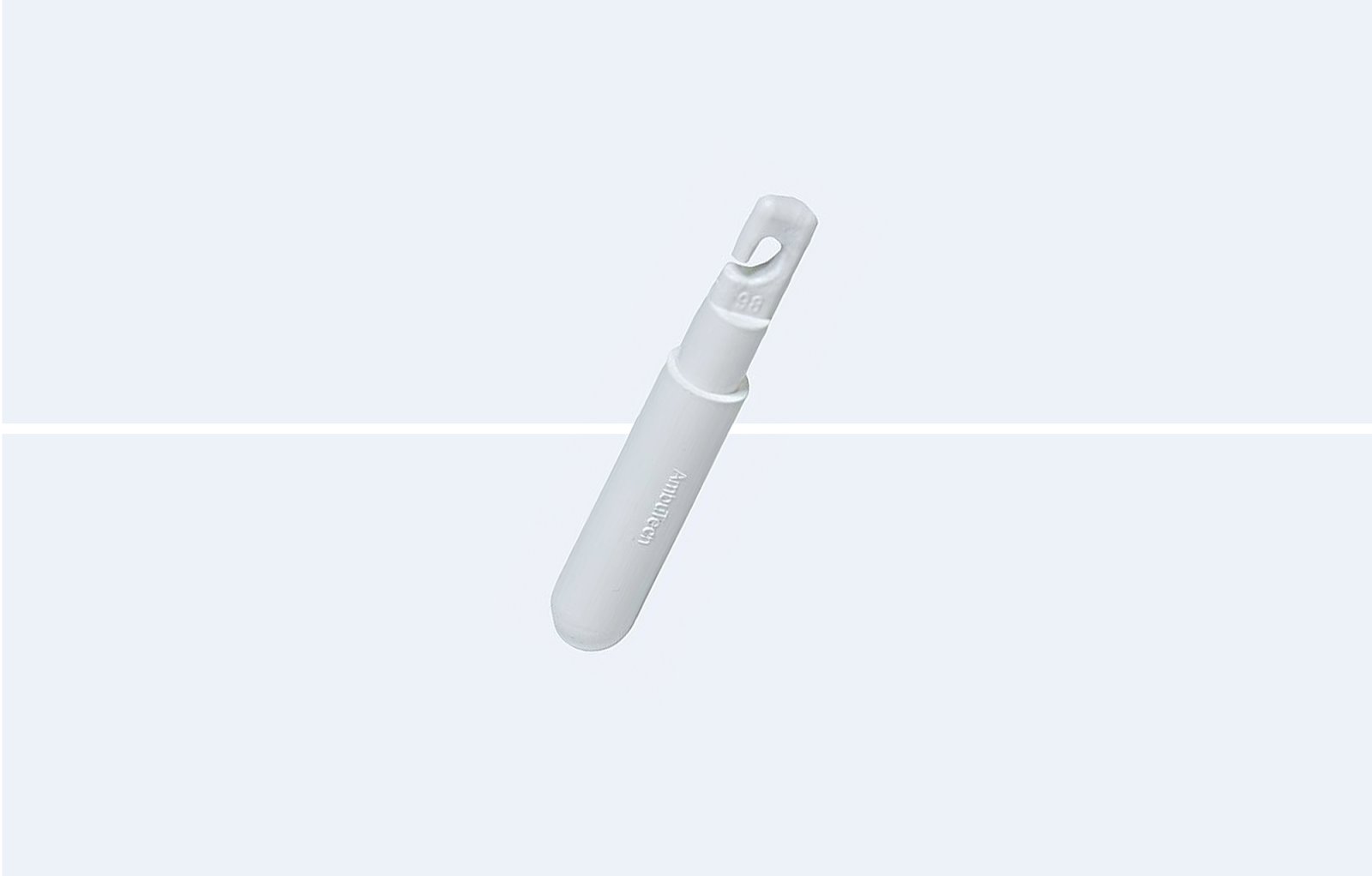 Тифлокомментарий: цветной фотоколлаж. На сером фоне с белой горизонтальной линией по центру – узкий вытянутый наконечник белого цвета со скругленным концом. Это наконечник-карандаш с пластмассовым креплением-крючком. Наконечник слегка наклонен вправо.