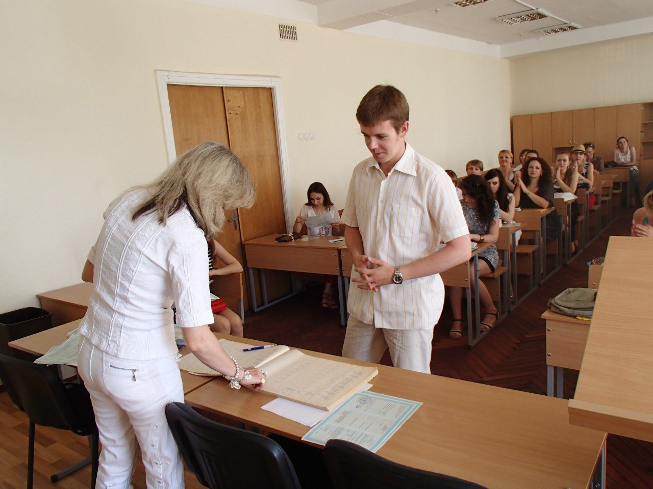 Тифлокомментарий к изображению: на фотографии из архива Вячеслава Еремина - вручение диплома в университете НПУ имени М.П. Драгоманова. 2016 год. Учебный класс, за партами сидят студентки. Вячеслав в белой рубашке с короткими рукавами и белых брюках стоит перед столом, на котором лежит ведомость и напечатанные дипломы. Он улыбается. Перед ним - тоже в белой блузке и белых брюках - женщина со светлыми волосами. Она ведет рукой по ведомости.