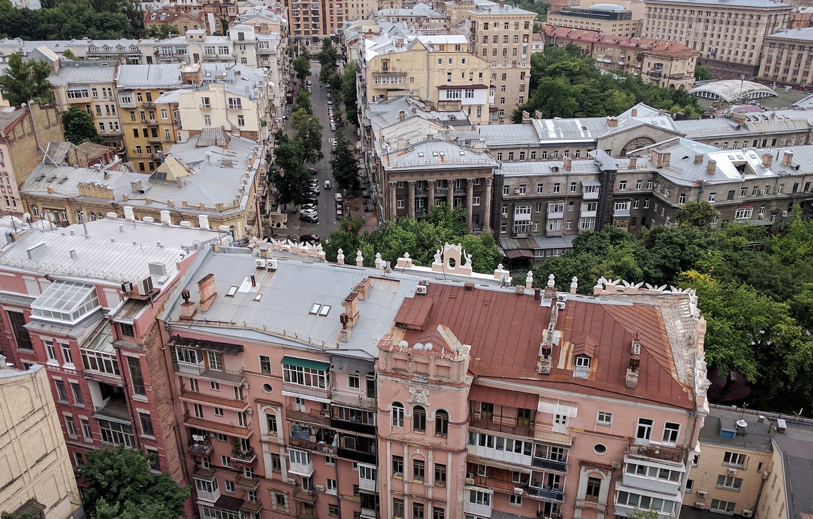 Тифлокомментарий к фотографии: Улицы Киева с высоты птичьего полета. Ровные улочки, многоэтажные дома разных стилей и разных цветов, обилие зелени.