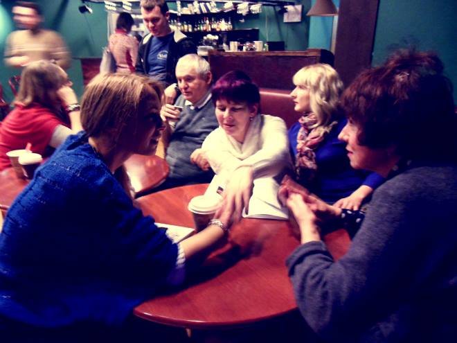 Тифлокомментарий: на цветной фотографии за круглыми деревянными столиками кафе сидят люди. На столике стоит картонный стакан и разложены листы бумаги. За столиком на переднем плане - четыре женщины. Молодая девушка с русыми волосами в синем просторном свитере - Екатерина Сахно - сидит слева и внимательно смотрит на свою соседку, женщину средних лет с каштановыми волосами в фиолетовой кофте, Наталью Оралову. Правая рука Екатерины лежит на столе, поверх ее кисти лежит рука женщины в белом свитере с фиолетовыми волосами, которая сидит напротив нее, Ирины Поволоцкой. Рядом с Ириной - молодая женщина со светлыми волосами в синем платье и розовом шарфе - Виктория Виолло-Авдеева. Она смотрит в сторону соседнего столика, за которым сидят пожилой мужчина в сером жилете - профессор Суворов - и женщина средних лет в красном свитере - Александра Золотова. Мужчина пьет чай.
