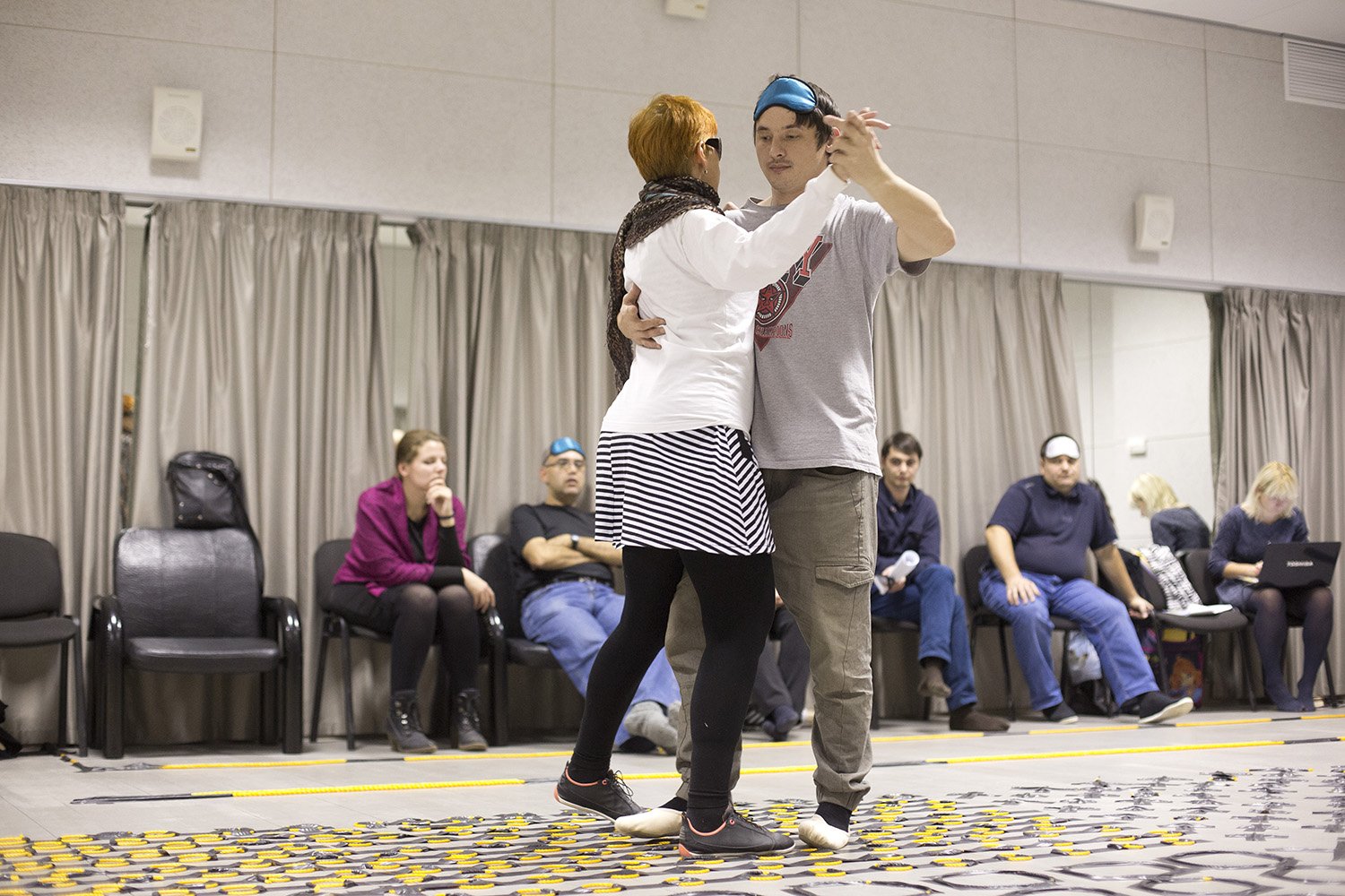 Тифлокомментарий: на цветной фотографии большой зал с рельефными направляющими на полу. В центре зала Михаил Видякин танцует в паре с Ириной Поволоцкой. Михаил - темноволосый молодой человек. На нем серая футболка, серые штаны, на ногах белые балетки, на голове повязка для глаз, которая поднята на лоб. У Ирины короткие рыжие волосы. Она одета в светлую тунику, черные леггинсы и кроссовки. На заднем плане вдоль стены расставлены черные стулья, на которых сидят люди, наблюдающие за танцующей парой.