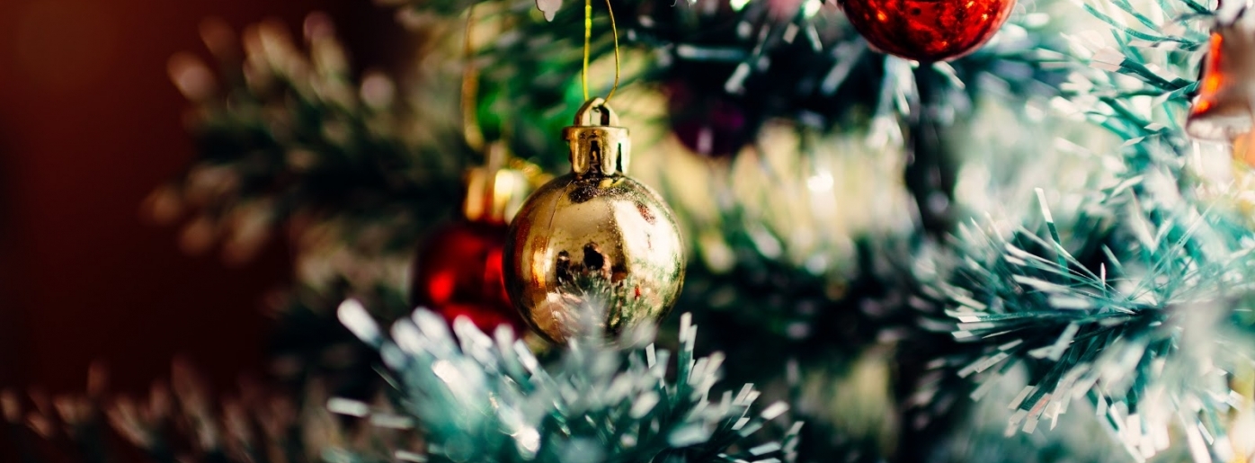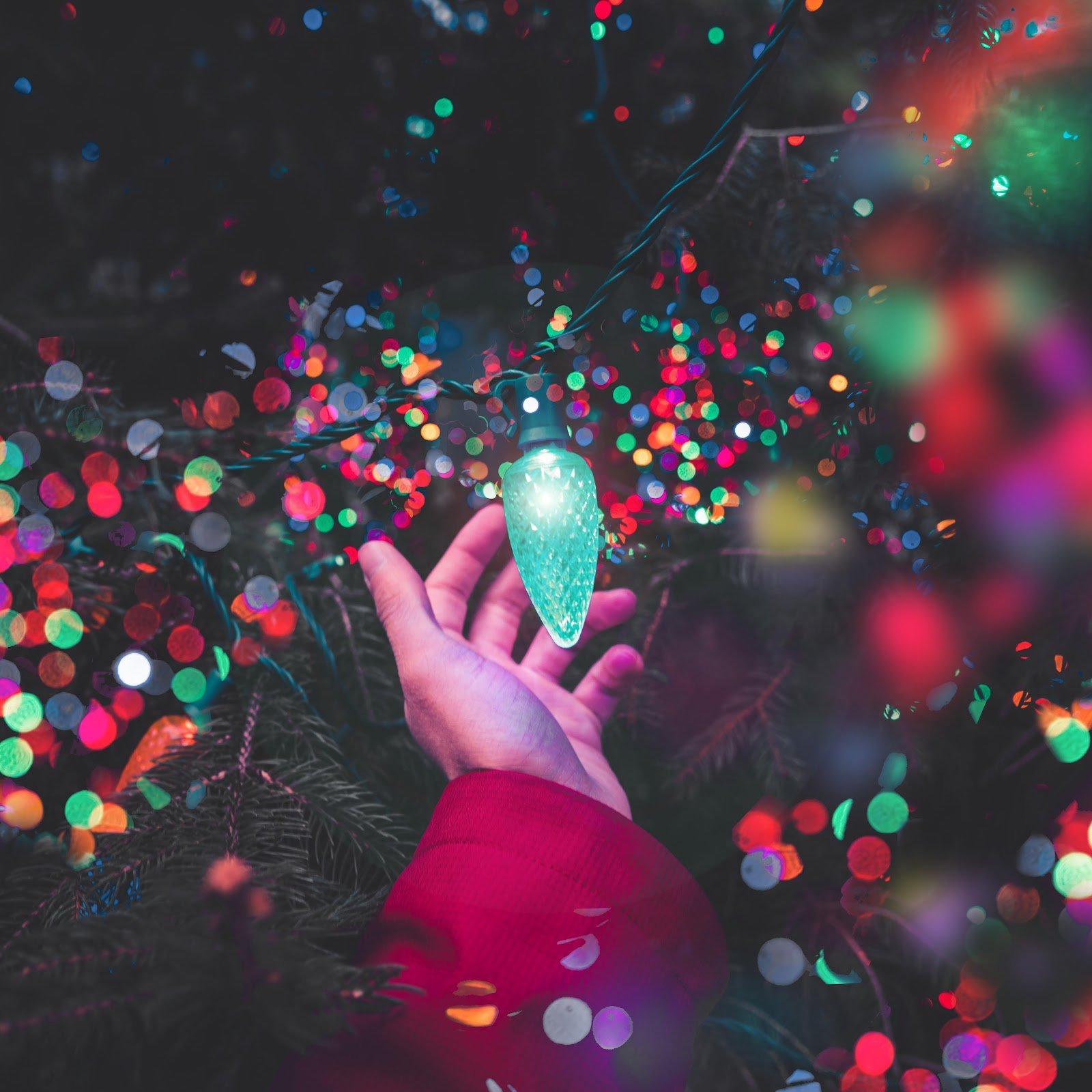 Тифлокомментарий: цветная фотография. Рука аккуратно касается зеленого фонарика в виде шишки, висящего на гирлянде на ветках елки. Все вокруг расплывается разноцветными светящимися круглыми бликами, похожими на конфетти.