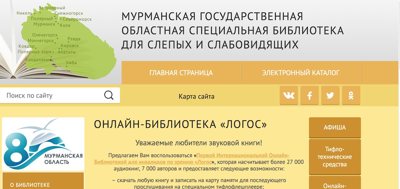 Тифлокомментарий: раздел «Онлайн-библиотека «Логос» на сайте Мурманской государственной областной специальной библиотеки слепых. Сверху на белом фоне фотография раскрытой книги, полупрозрачный зеленый силуэт карты Мурманской области с отмеченными городами и полное название библиотеки. Чуть ниже — разделы страницы разных оттенков бежевого цвета. На горизонтальном меню расположены кнопки «Главная страница», «Электронный каталог», строка поиска по сайту, карта сайта и значки соцсетей. В рабочем поле — информация об онлайн-библиотеке «Логос».
