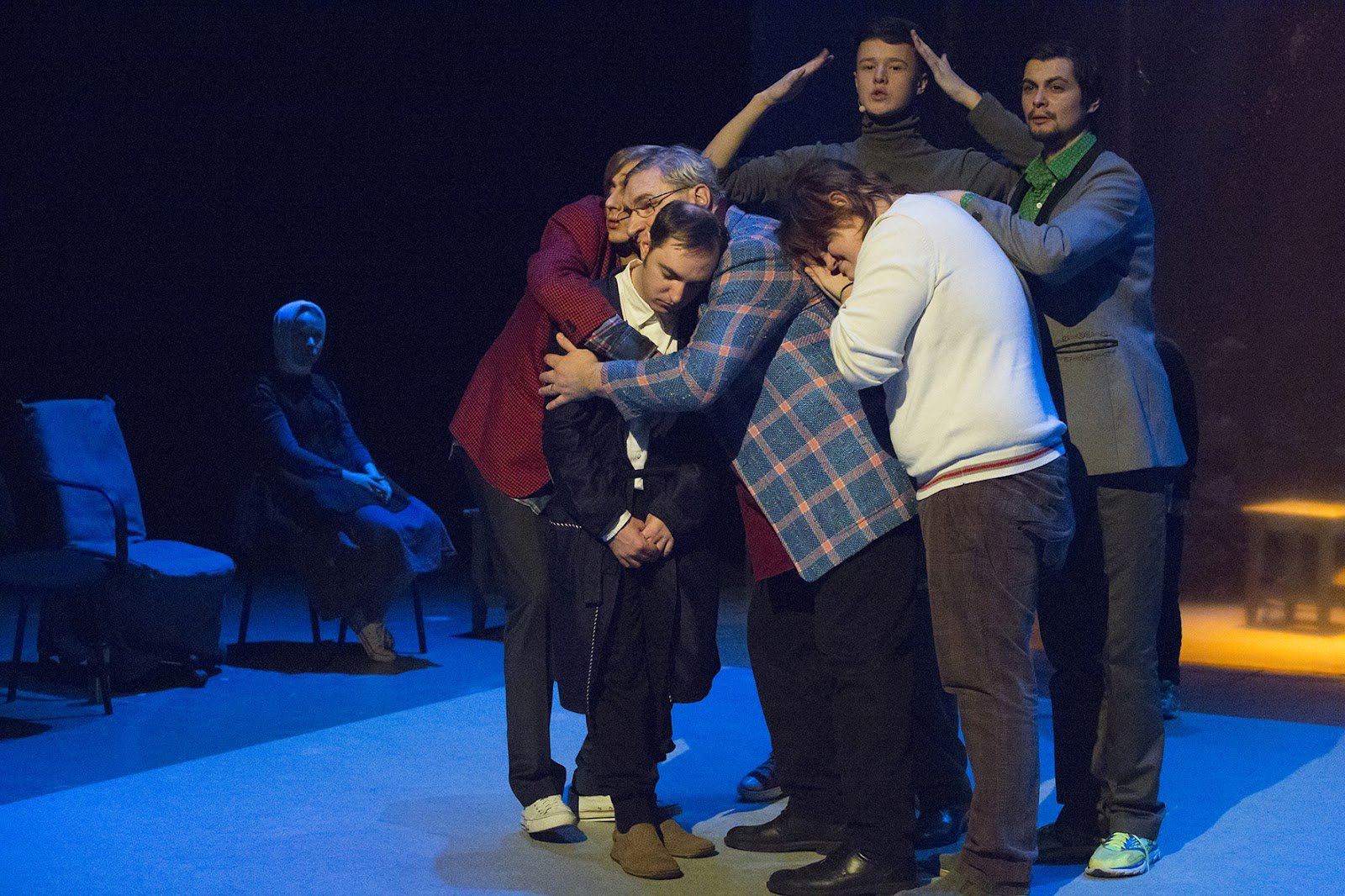 Тифлокомментарий: цветная фотография. Спектакль. Сцена освещена синим цветом, на ней шестеро мужчин. Они стоят сгрудившись и обнимаются. Все собрались вокруг молодого человека, он склонил голову, закрыл глаза и опустил руки. Один из мужчин стоит позади, показывает руками перед собой крышу дома и что-то произносит. В глубине сцены девушка сидит на кресле и наблюдает за мужчинами. Она одета в длинное закрытое платье, на голове платок.