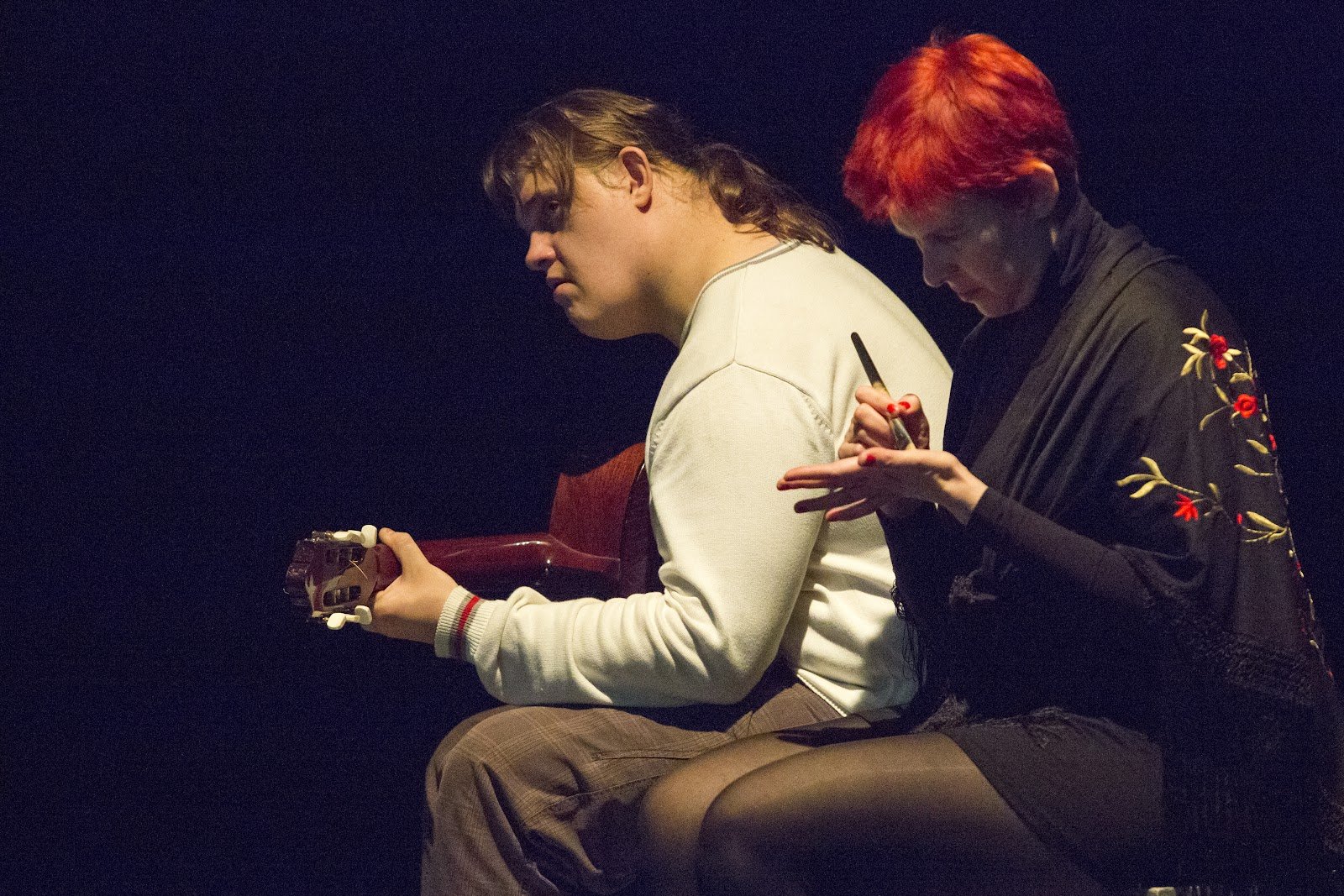 Тифлокомментарий: цветная фотография. Спектакль. На скамье в профиль сидят актриса Ирина Поволоцкая и актер Никита Паничев. Никита одет в коричневые клетчатые брюки и белый свитер. Он держит в руках гитару и смотрит перед собой. Его русые волосы завязаны в хвост, на глаза спадает челка. Ирина одета в черное короткое платье и черную шаль с вышитыми цветами красного цвета. У нее короткие красные волосы и ярко-красный маникюр. Она склонила голову и водит по ладони кисточкой.