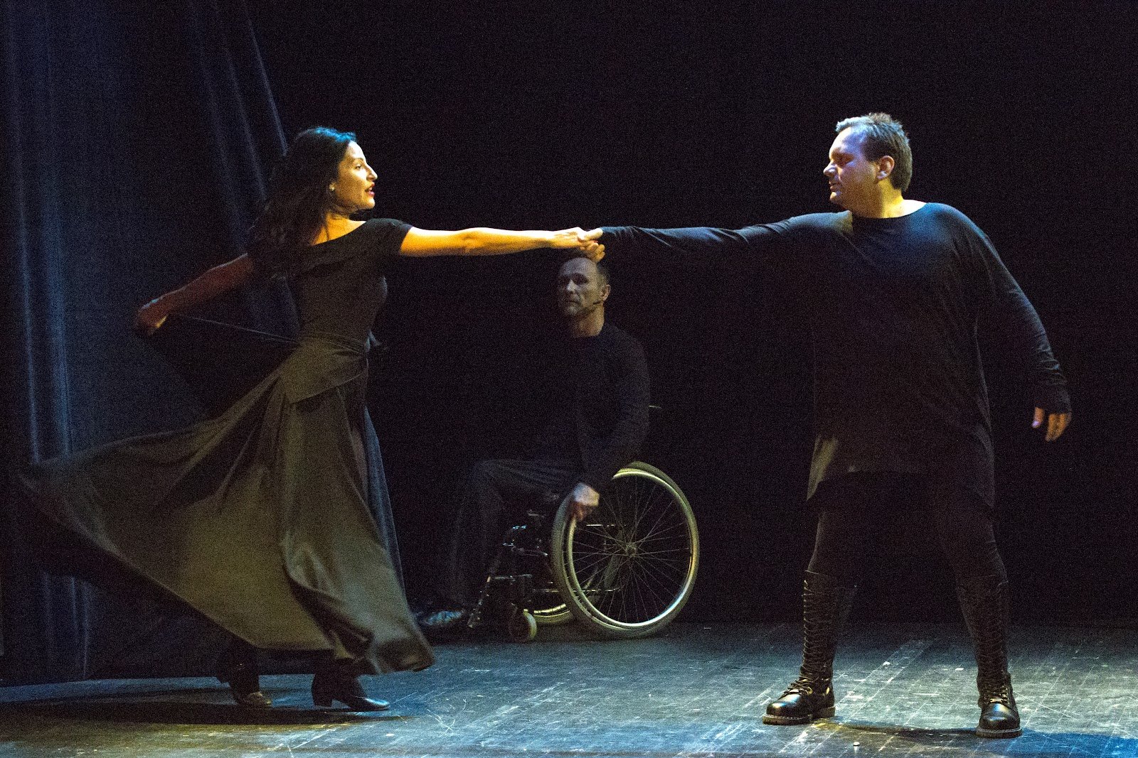 Тифлокомментарий: цветная фотография. Спектакль, сцена с черными полом, кулисами и задником, на ней три артиста, все в черной одежде. Впереди танцуют мужчина и женщина. Мужчина плотного телосложения в джинсах, высоких шнурованных ботинках и свободной футболке стоит, широко расставив ноги, и на вытянутой руке держит женщину за руку, глядя ей в глаза. Женщина кружится, держа свободной рукой подол длинной юбки. Юбка поднимается и завивается в движении. У женщины густые черные волосы до плеч, прямая спина, корпус повернут к партнеру. В глубине сцены за ними наблюдает мужчина черной одежде в инвалидной коляске.