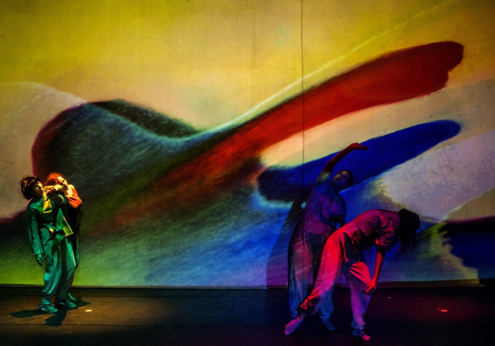 Тифлокомментарий: цветная фотография. Спектакль. На сцене танцуют четыре женщины в свободных одеждах на фоне большого полотна, на которое проецируется абстрактное разноцветное изображение. Слева две женщины замерли, немного отклонившись назад. Они освещены зеленым и красным. Справа одна актриса стоит расслабленно, отклонившись влево с поднятой рукой, будто тянется в сторону. Вторая стоит согнув колени и развернувшись корпусом назад и влево. Правой рукой она опирается о левое колено, а правая нога едва касается пола. Голова опущена вниз. Эта пара освещена розовым и синим. Движения женщин повторяют формы изображения позади них.