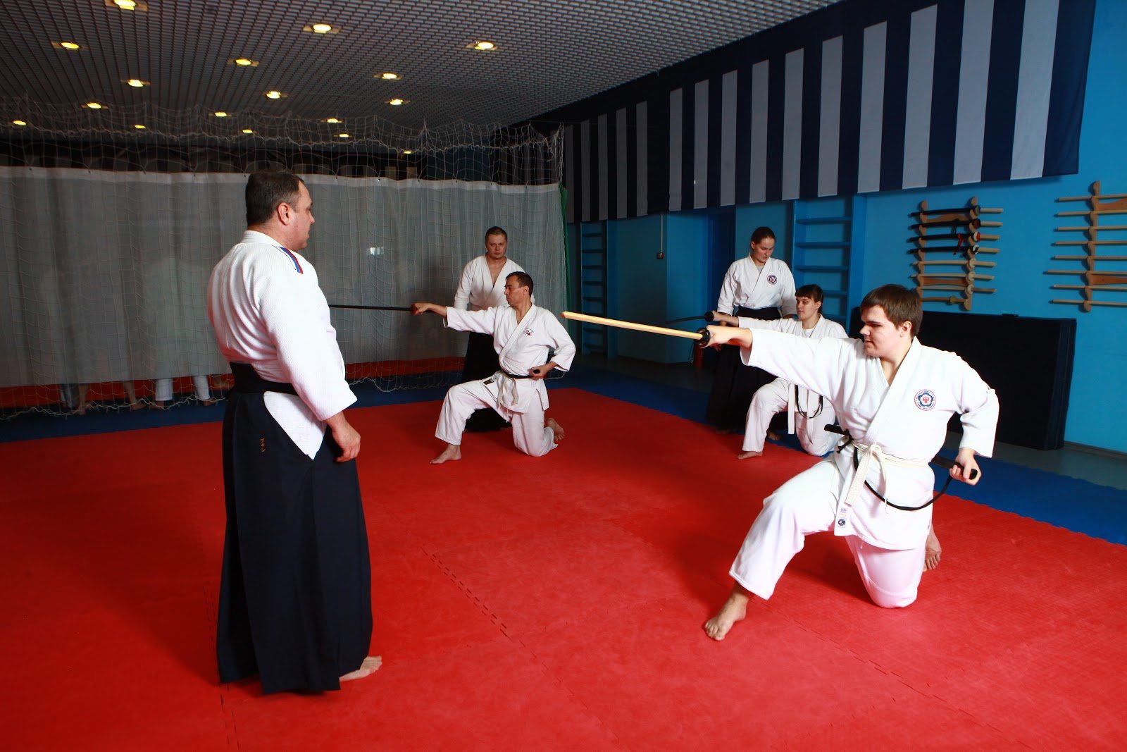 Тифлокомментарий: цветная фотография. Просторный зал с красным ковром, синими стенами и светлой ширмой посередине. В зале проходит занятие по айкидо. Мужчина в белой куртке и черных широких штанах стоит перед тремя босыми учениками в белых кимоно. На поясе у каждого закреплена катана в черных ножнах. Ученики стоят на левом колене, выставив вперед правую согнутую в колене ногу. В правой вытянутой вперед прямой руке они держат посохи, левая согнутая в локте рука отведена назад и держит рукоятку катаны.