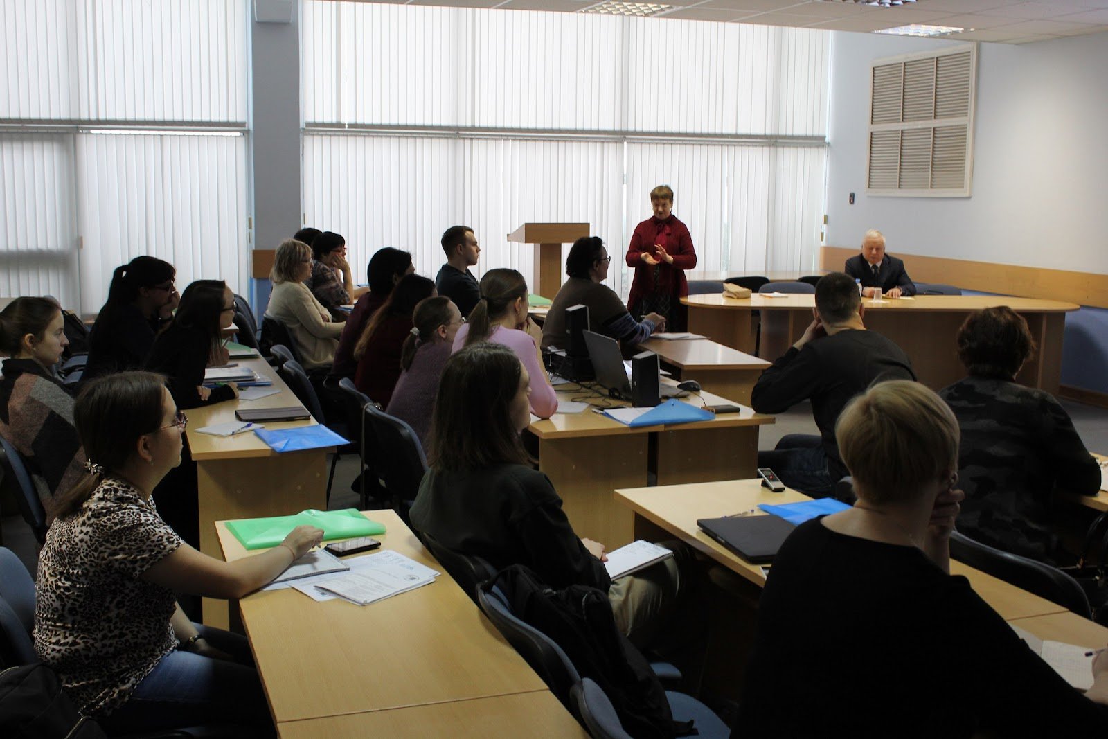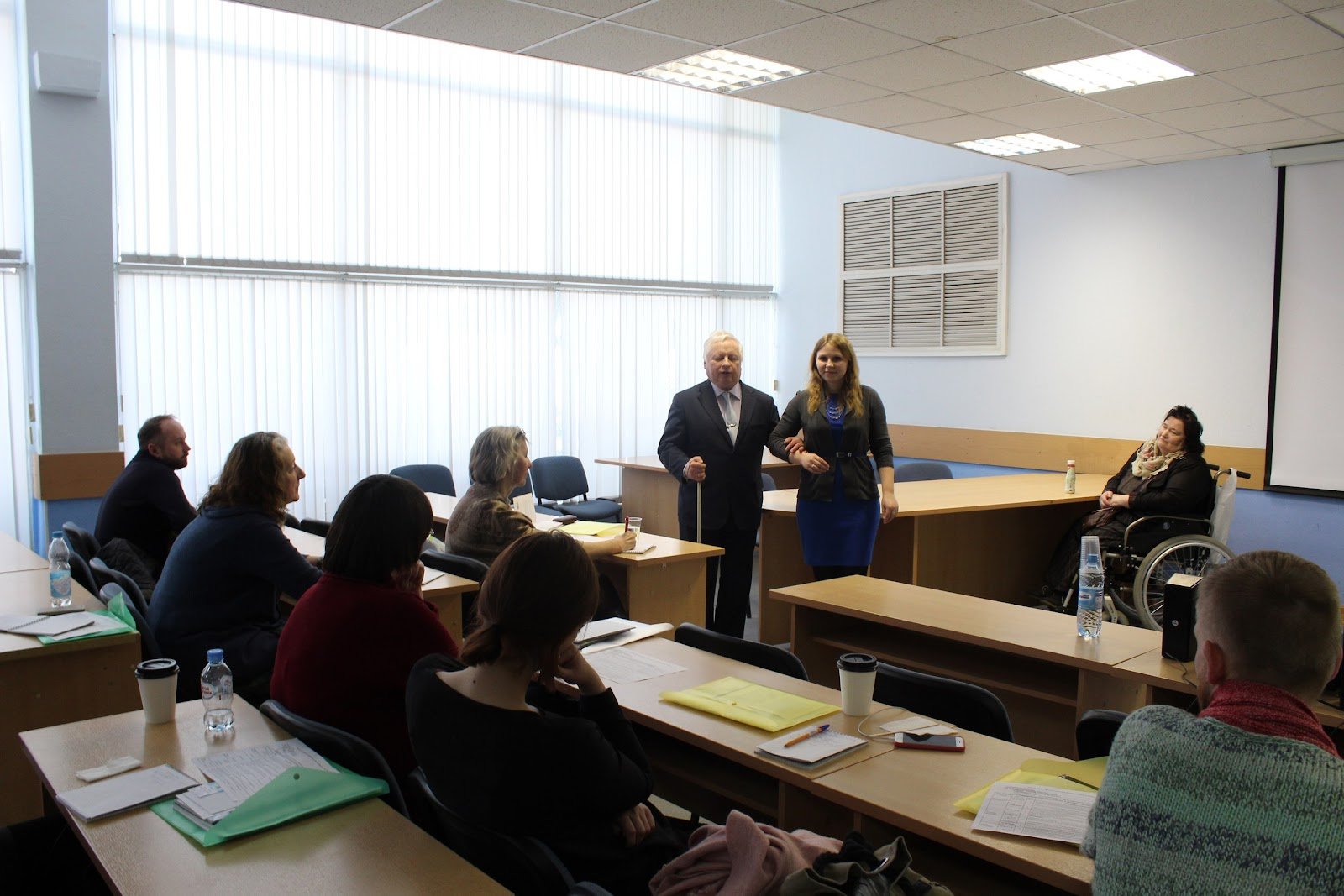 Тифлокомментарий: цветная фотография. Учебная аудитория во время занятия. На одной из стен висит экран, рядом стоит стол и стул. У стола сидит женщина в инвалидной коляске. Перед столом стоит Сергей Николаевич Ваньшин в костюме и с тростью и держит под руку девушку. Перед ними за длинными партами сидят мужчины и женщины, они смотрят на Сергея Николаевича с девушкой. На партах лежит бумаги, ручки, стоят бутылки с водой и стаканчики с кофе.