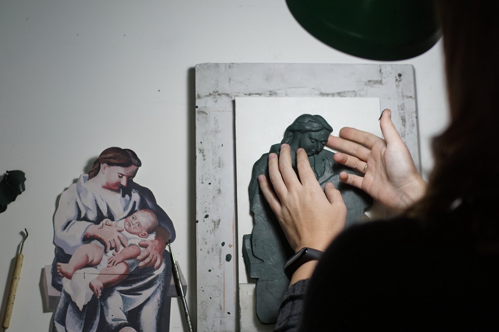 Тифлокомментарий: цветная фотография. На белом столе лежит вырезанная по контуру репродукция женской фигуры с младенцем на коленях с картины Пабло Пикассо «Мать и дитя» 1921 года. Мать склонила голову к младенцу и бережно придерживает его обеими руками с непомерно большими и толстыми пальцами. Пропорции фигур деформированы, укрупнены и словно растянуты. Рядом на гипсовой доске - рельефная копия изображения из серого скульптурного пластика. Лицо женщины на рельефной копии тактильно осматривают руки с тонкими пальцами. На левой руке - фитнес-трекер.