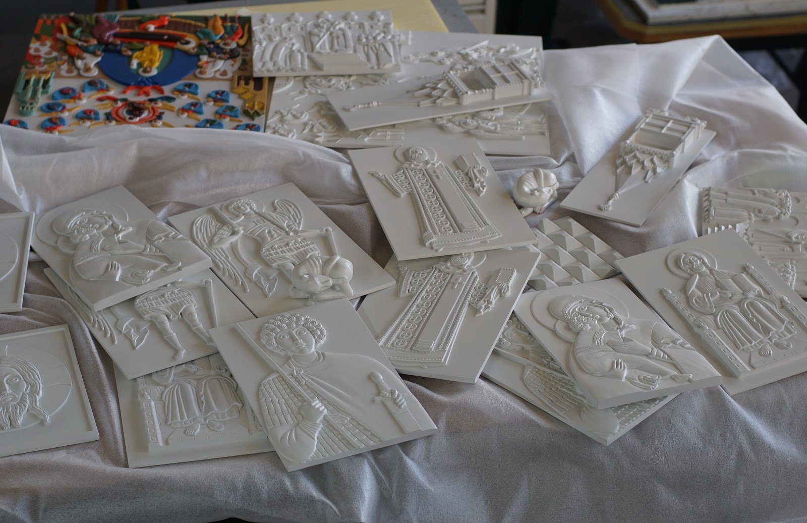 Тифлокомментарий: цветная фотография. На столе, покрытом белой тканью, беспорядочно разложены белые пластиковые тактильные копии с изображением стены Грановитой палаты, царского трона из Успенского собора, Богоматери с младенцем на руках, архангела Михаила и другие. Некоторые копии представлены в нескольких экземплярах. На дальнем углу стола лежит раскрашенная пластиковая копия изображения успения Богородицы.
