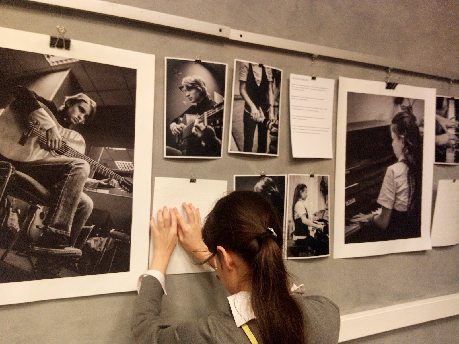 Тифлокомментарий: цветная фотография. На серой стене подвешены черно-белые фотографии. На одних фотографиях девушка играет на гитаре, на других — девушка за фортепиано. Между снимками подвешены листы А4 с текстом, на одном из них текст набран шрифтом Брайля, его читает руками девушка в сером джемпере поверх белой рубашки, ее длинные каштановые волосы убраны в хвост.