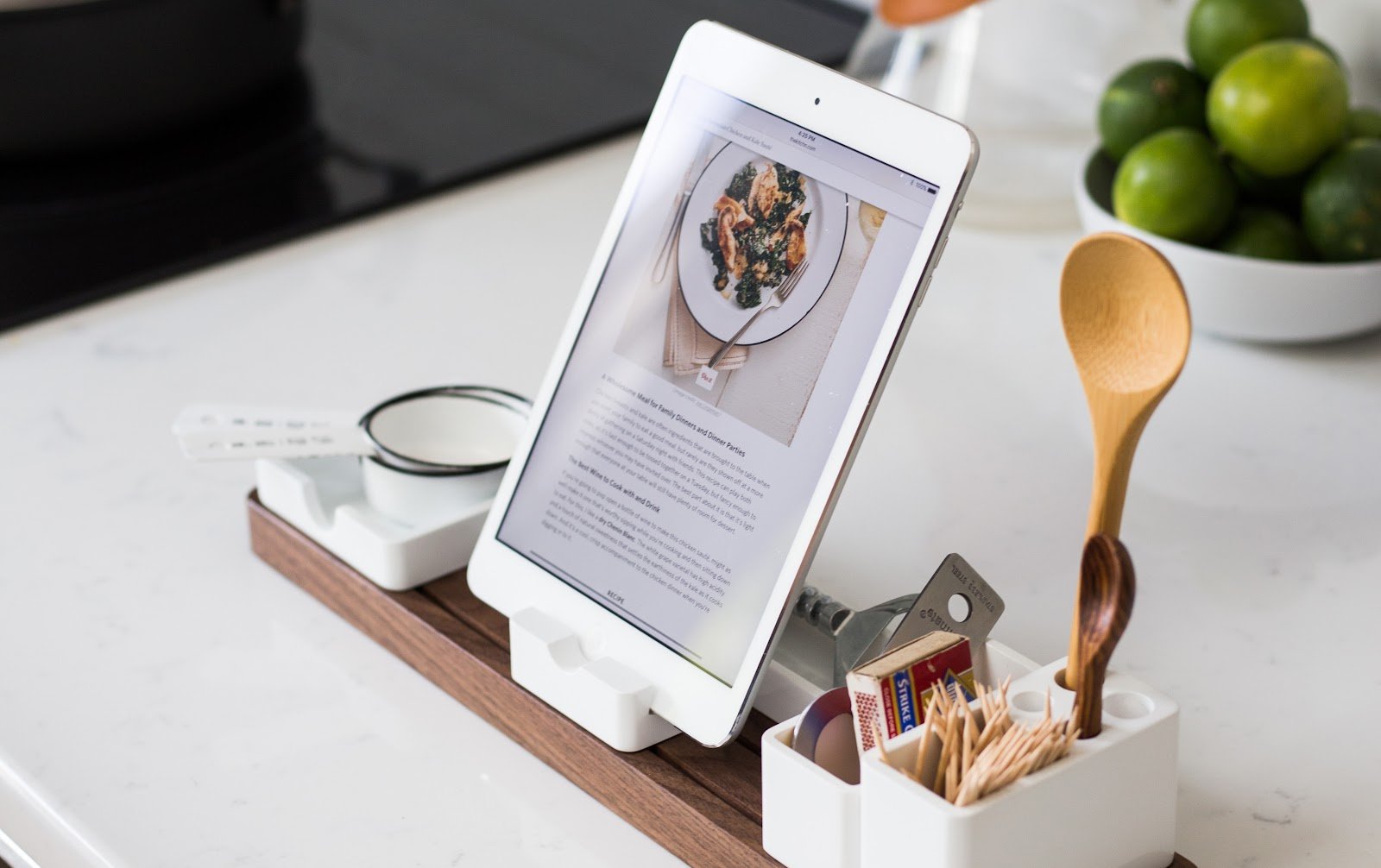 Тифлокомментарий: цветная фотография. На белом столе стоит деревянная подставка с белыми отделениями. В отделении слева лежат мерные ложечки, на следующем закреплен включенный планшет, открытый на странице с рецептом, в третьем отделении — коробок спичек и другие мелочи, в четвертом — зубочистки и две деревянные ложки: светлая длинная и темная короткая. Чуть дальше на столе стоит белая пиала с лаймами.
