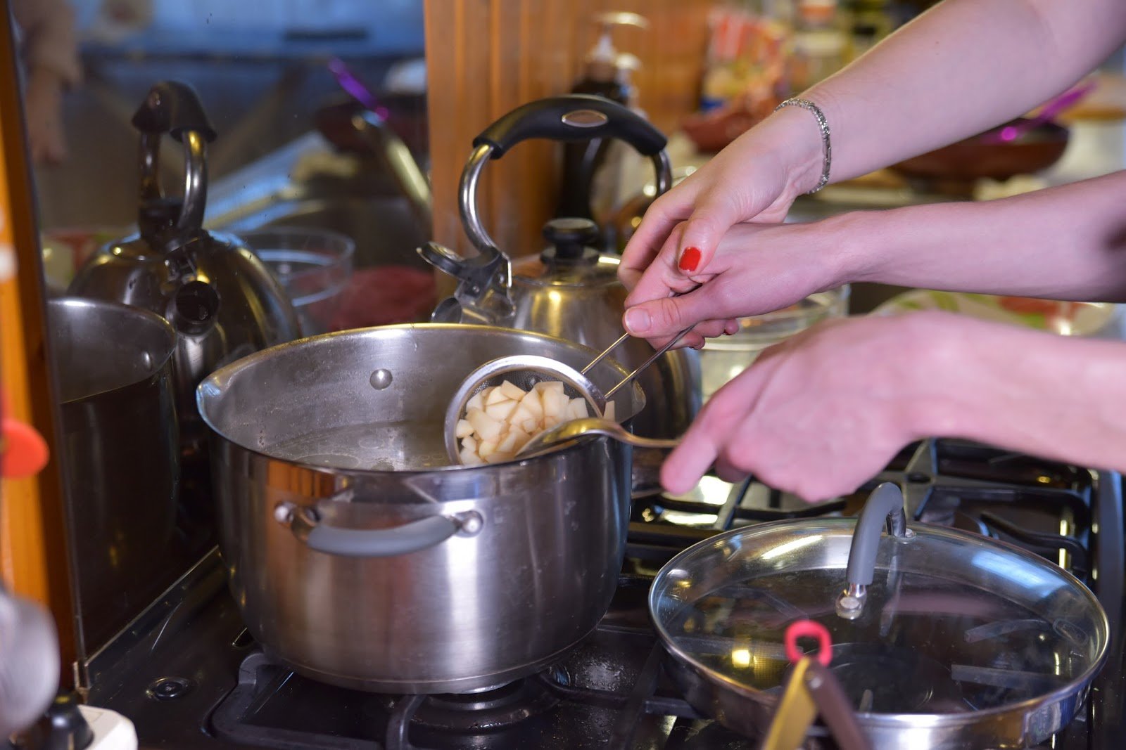 Тифлокомментарий: цветная фотография. На газовой плите стоит кастрюля, на соседней конфорке лежит крышка от кастрюли. Две руки подростка вытаскивают мелко нарезанные фрукты из воды с помощью сита и ложки. Рука Марты поддерживает руку подростка с ситом. Рядом на плите стоит металлический чайник.