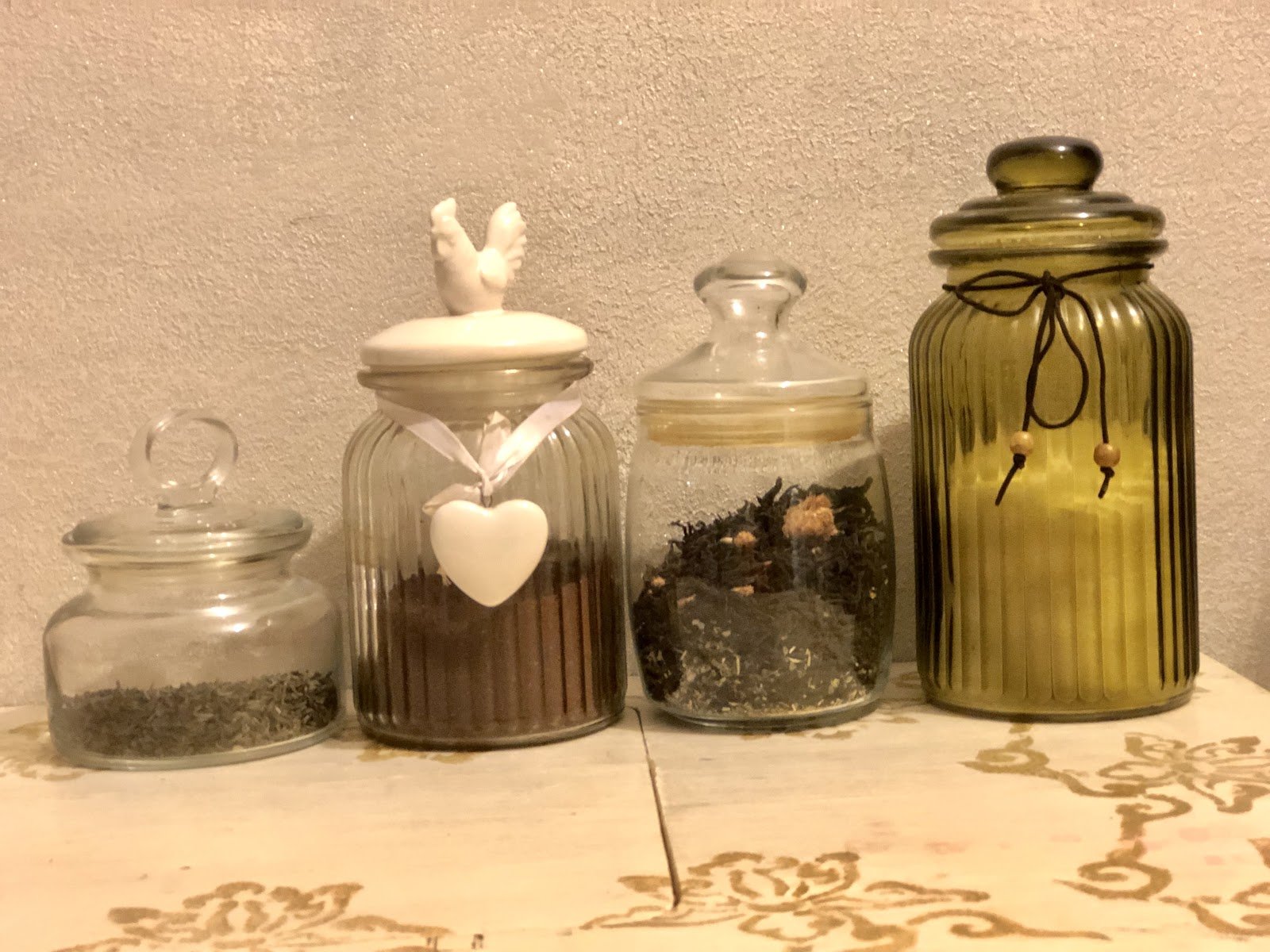 Тифлокомментарий: цветная фотография. На столе стоят четыре стеклянные банки разного размера. Слева направо: маленькая гладкая стеклянная банка под крышкой с ручкой в виде кольца, внутри сухая трава; ребристая банка побольше с какао внутри, вокруг горлышка обернута лента с белой подвеской в форме сердца, на крышке ручка в виде фигурки петуха; гладкая банка с чаем под стеклянной крышкой с ручкой; высокая стеклянная ребристая банка зеленого цвета с сахаром, вокруг горлышка обернута нитка с деревянными бусинами на концах.