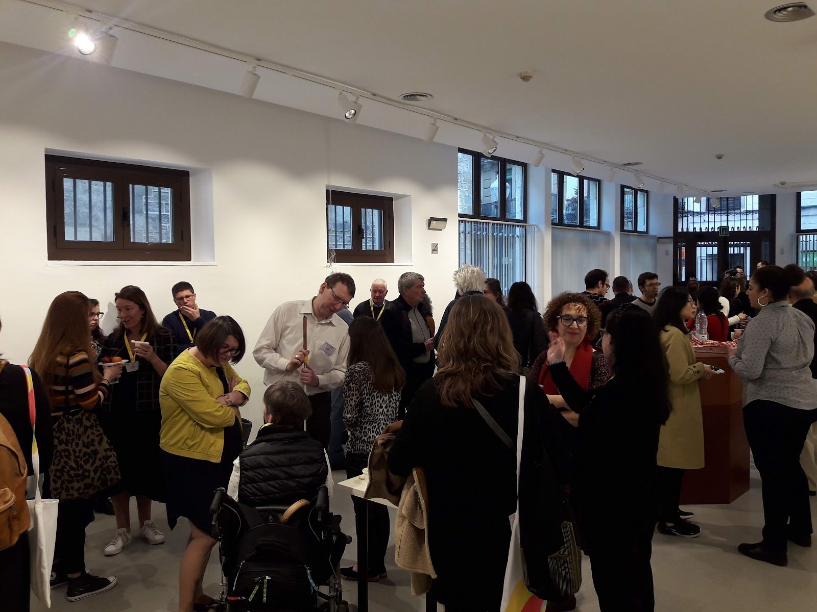 Тифлокомментарий: цветная фотография. Фуршет в небольшом зале, заполненном людьми, которые разбились на небольшие группы. Они оживленно о чем-то разговаривают, у некоторых в руках закуски. В частности, беседу ведут темноволосый мужчина в белой рубашке и черных брюках с белой тростью в руках и женщина в инвалидном кресле в белой рубашке и черной жилетке. Скрестив руки на груди, к ней склонилась темноволосая женщина в черном платье и желтой куртке.