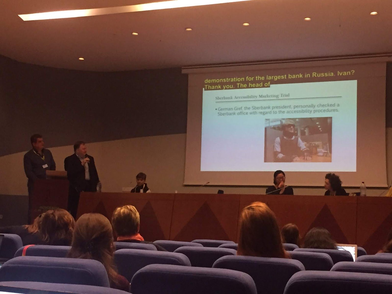 Тифлокомментарий: цветная фотография. Тот же актовый зал. За трибуной стоят двое мужчин в темных деловых костюмах. Это Алексей Козуляев и Иван Борщевский. Они смотрят на экран, где демонстрируется слайд презентации с текстом на английском языке и фотографией. На ней изображен светловолосый мужчина в костюме GERT — технологичном симуляторе различных форм инвалидности и заболеваний: черном жилете, нарукавниках, шейном бандаже, наушниках и темных очках. Это глава «Сбербанка России» Герман Греф.