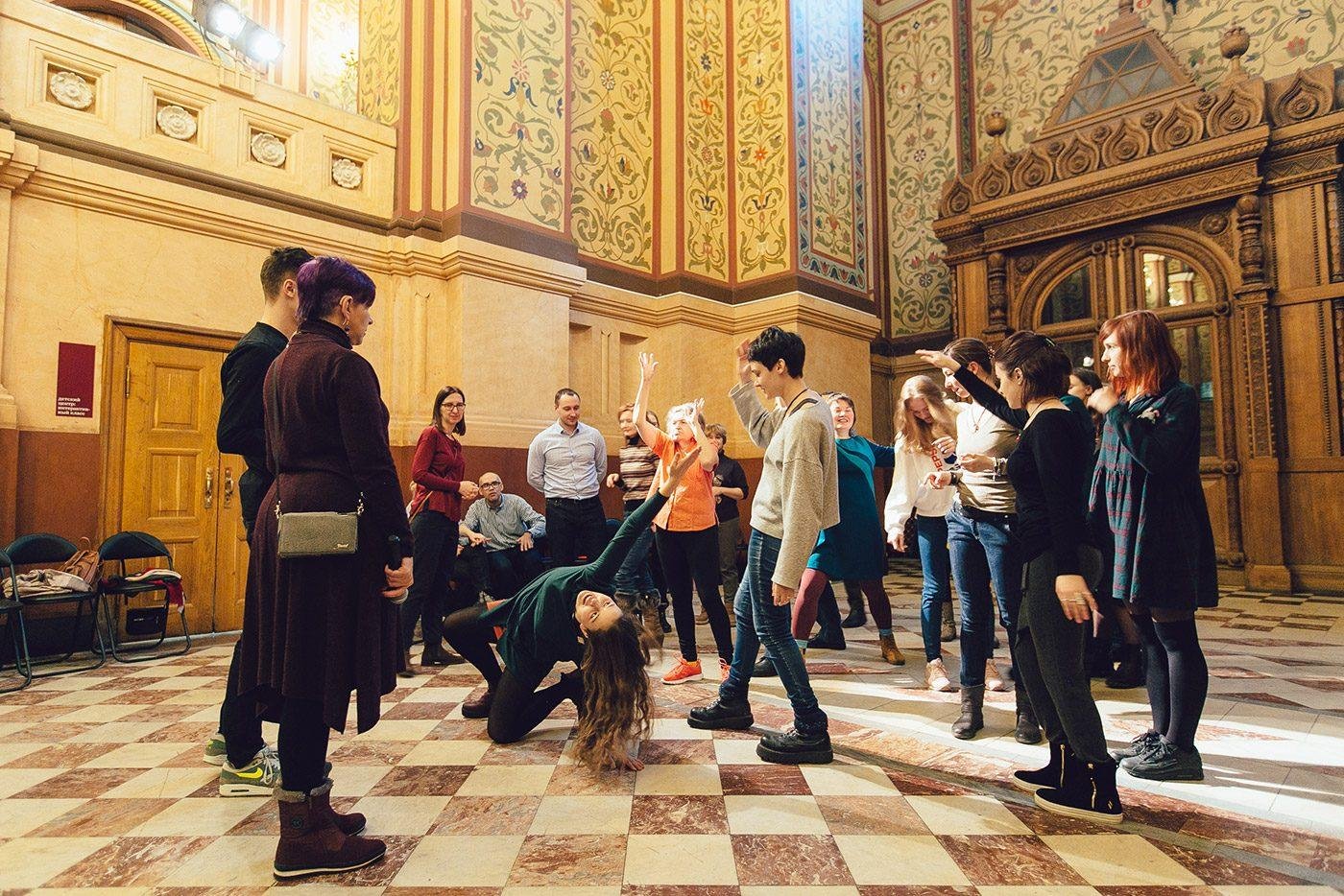 Тифлокомментарий: цветная фотография. В торжественном зале с высокими потолками, клетчатой плиткой и цветочным орнаментом на стенах стоят в кругу мужчины и женщины, перформеры. Среди них стоит Ирина Поволоцкая. В центре круга танцуют девушка и молодой человек. Девушка встала на колено и отклонилась назад, одной рукой опершись об пол, а другую вытянув вверх.