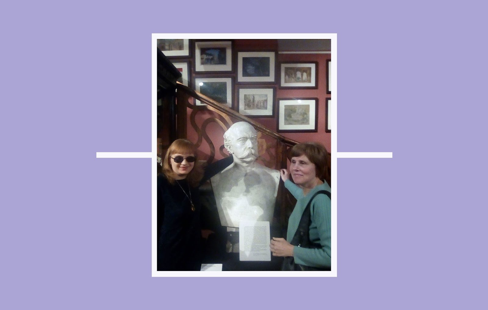 Тифлокомментарий: на фиолетовом фоне цветная фотография в белой рамке. Две женщины стоят по обеим сторонам гипсового бюста мужчины с большой залысиной, густыми усами и сосредоточенным взглядом. У женщины слева темный наряд, русые волосы до плеч, темные очки. Она улыбается и левой рукой приобнимает бюст. Это Лариса Овцынова. Женщина справа в голубой кофте с короткими русыми волосами правой рукой прикасается к бюсту и улыбается. На плечо накинута темная сумка, взгляд не сфокусирован. За ними деревянная лестница с витиеватыми перилами и бордовая стена с фотографиями в темных рамках.